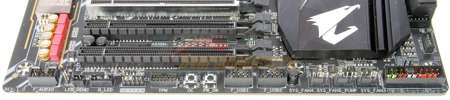 Ниже, фактически уже в правом нижнем углу платы мы найдем колодку THB_C, которая предназначена для подключения дополнительной панели Gigabyte Thunderbolt, и восемь разъемов SATA 6 Гбит/с.