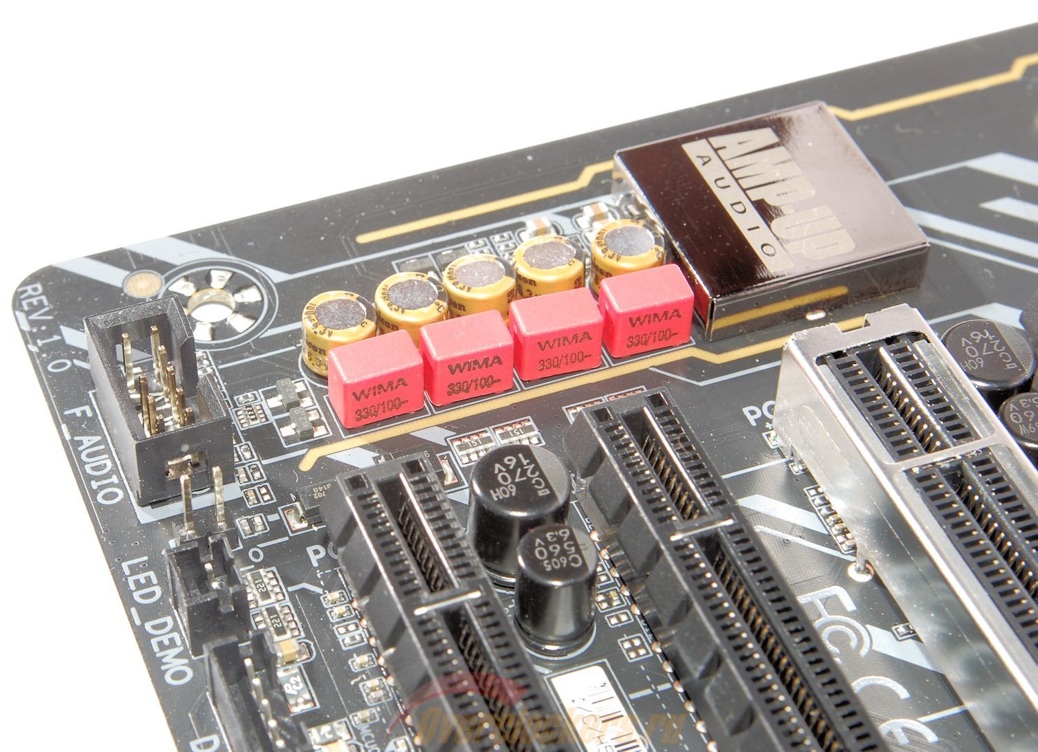 Аудиотракт, помимо крайне модных «Hi-End-конденсаторов» Nichicon и скрытого под металлической крышкой аудиоконтроллера Realtek ALC1220 (с интегрированным усилителем), несет в своем составе четыре пленочных конденсатора WIMA.