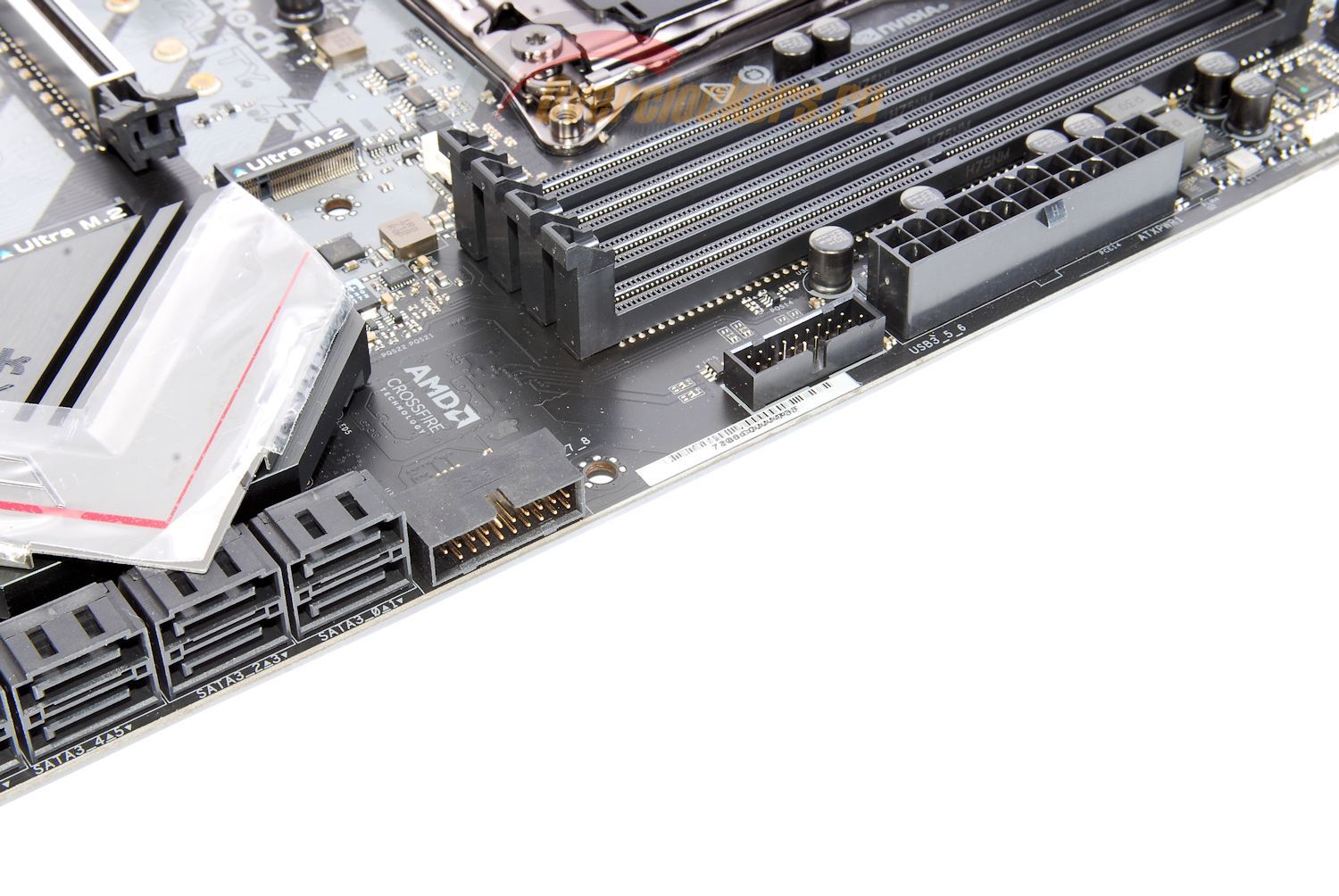 Под разъемом основного питания ATX расположено две 20-контактных колодки интерфейса USB 3.1 Gen1 (переименованный некоторое время назад интерфейс USB 3.0). Одна ориентирована перпендикулярно, вторая – параллельно поверхности плоскости материнской платы (как мы видели на фото чуть выше, применение «лежачего» разъема USB очень даже оправданно).