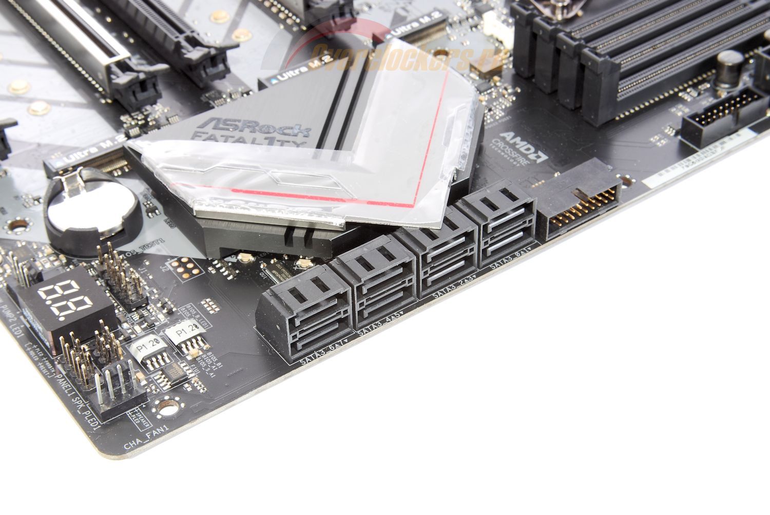 Ниже колодок USB, реализованных столь странным образом, размещено восемь разъемов SATA 6 Гбит/с, два из которых частично накрывает декоративная накладка радиатора. Все SATA реализованы посредством возможностей набора системной логики Intel X299, дополнительных контроллеров здесь не применятся.
