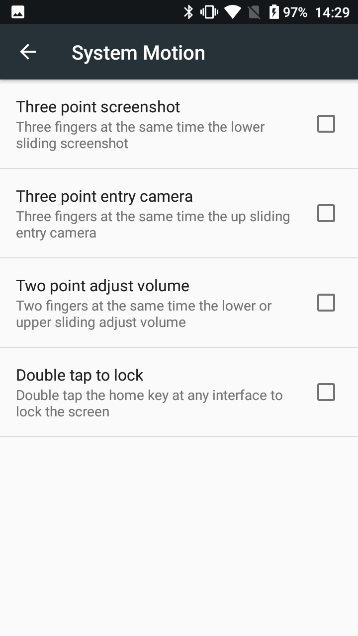 Добавились лишь только несколько типичных, для китайских аппаратов, пунктов меню. Они посвящены различным жестам, призванным облегчить и упростить работу с устройством. Традиционно русификация данных пунктов меню отсутствует.