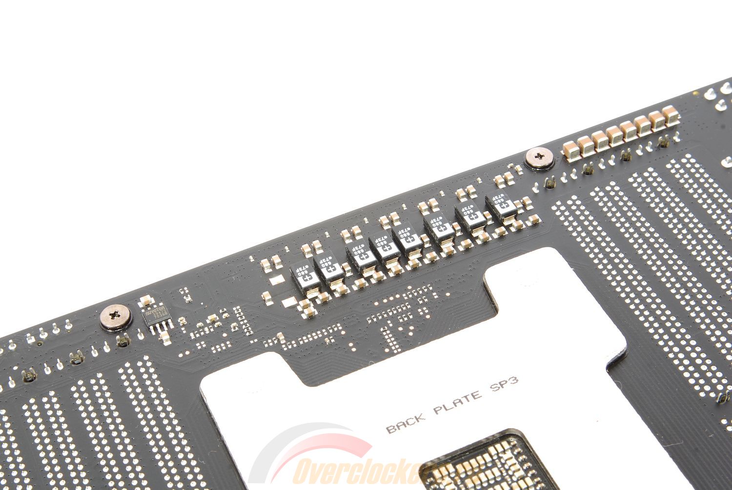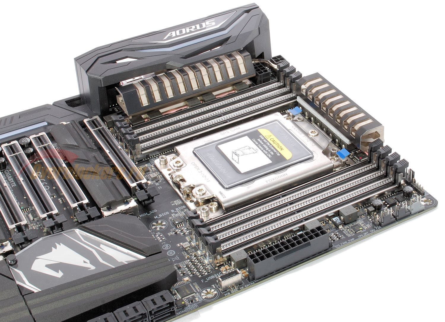 Однако на Socket TR4 свои нюансы все же имеются: немалый уровень энергопотребления процессора вкупе с тотальным дефицитом места из-за колоссальных размеров процессорного разъема и наличия восьми слотов памяти привели к «географическому» разделению преобразователей питания, формирующих указанные напряжения. В итоге первый (CPU VCore) остался над процессорным разъемом, второй (CPU NB/SoC) – на подавляющем числе материнских плат перемещен под процессорный разъем и лишен собственного теплоотвода. Рассматриваемая материнская плата Gigabyte отклоняется от этой схемы: на ней преобразователь CPU NB/SoC вынесен влево, за слоты оперативной памяти и полностью обособлен от CPU VCore – у него даже ШИМ-контроллер собственный.