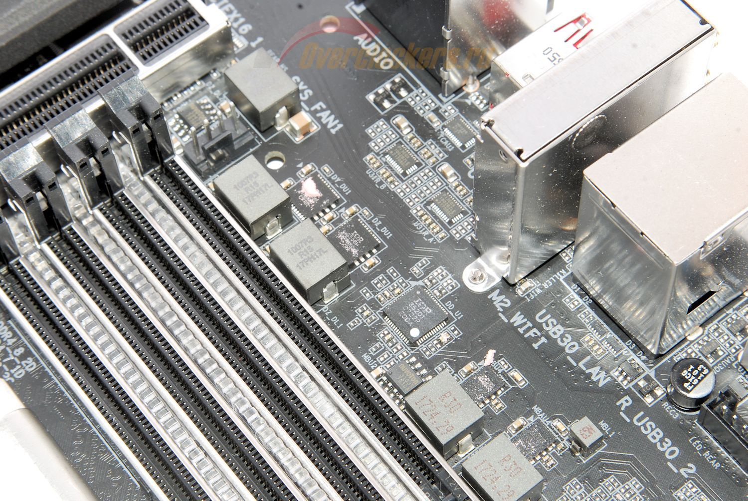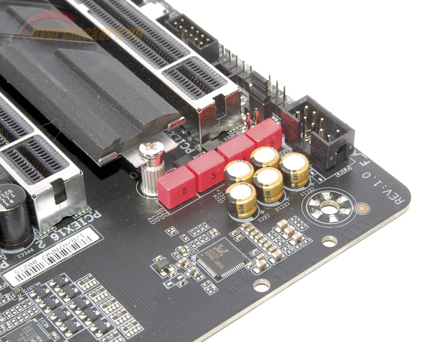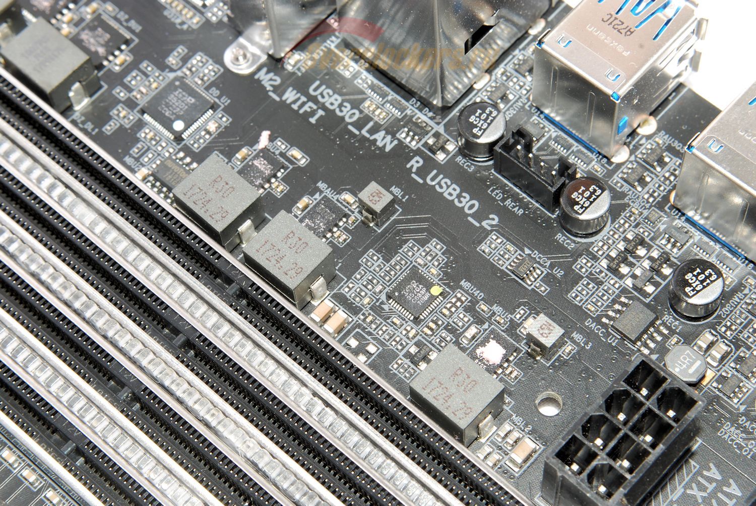 Вопреки ожиданиям, дополнительные усилители не установлены, используются только встроенные в Realtek ALC1220. Не хватает также еще одного элемента: аудиотракт не изолирован от остальной части платы участками текстолита без токопроводящих слоев.