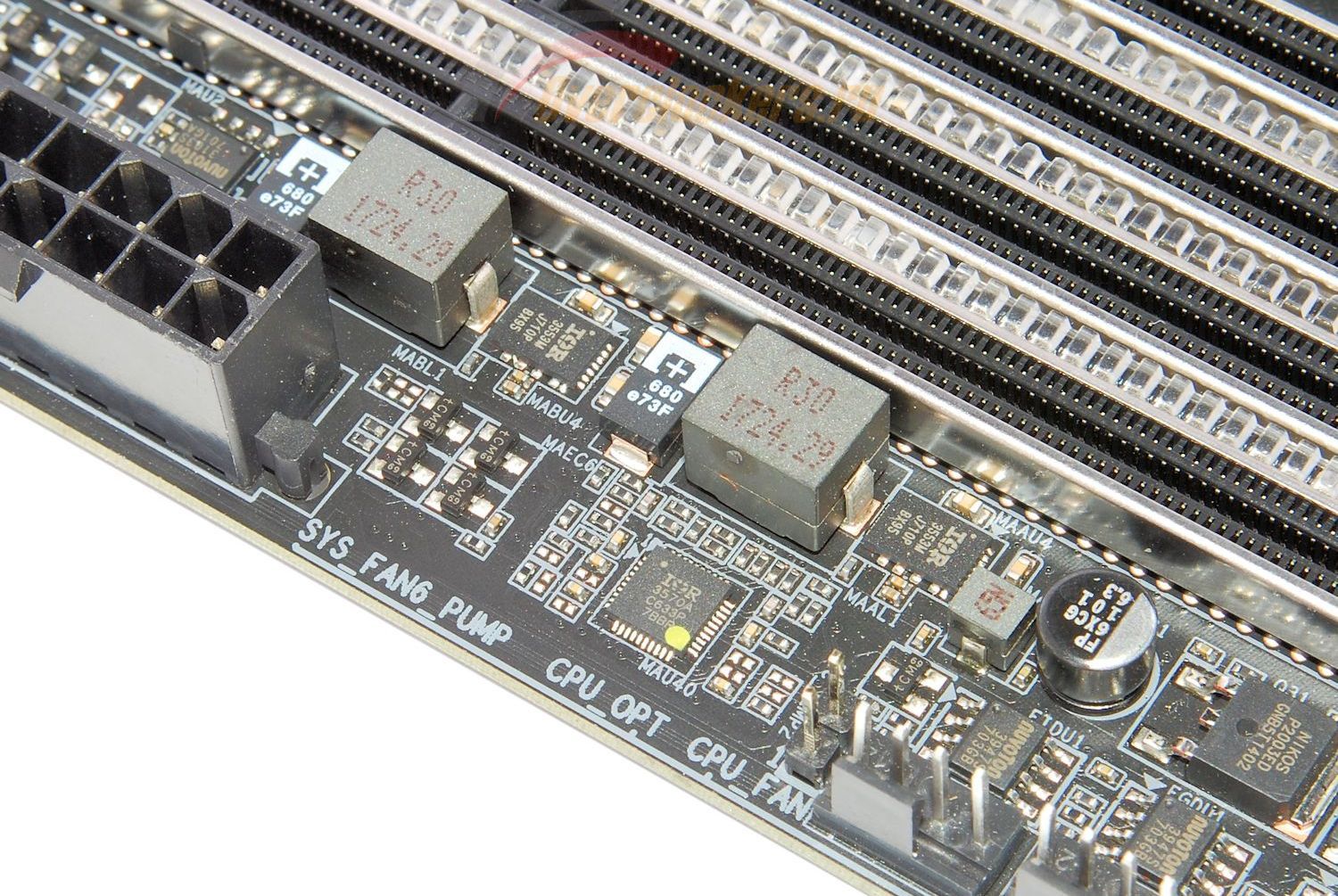 Питание памяти также раздельное (как, кстати, и на конкурирующем LGA2066) – группы из четырех слотов каждая питаются от отдельных идентичных двухфазных преобразователей.