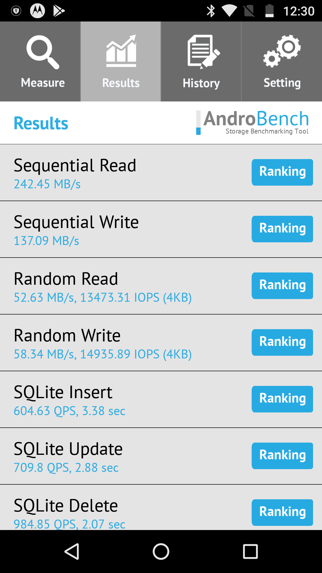 С помощью приложения AndroBench было проведено тестирование скорости работы файловой системы.