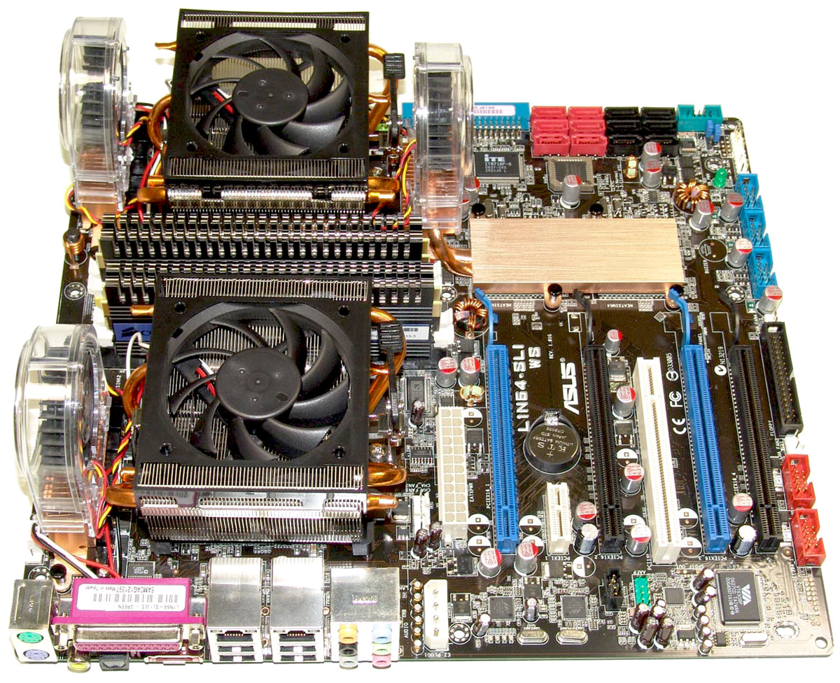 Начнем с материнской платы ASUS L1N64-SLI WS – уникальной и единственной в своем роде модели, выпущенной для энтузиастов с двумя Socket 1207 (Socket F) для двухъядерных процессоров с микроархитектурой AMD K8 на ядре «Windsor FX». Назначение платы было одно – борьба с четырехъядерными процессорами Intel Core 2 Quad/Extreme на ядре «Kentsfield». Плата насчитывает четыре разъема PCI-Express х16, работающих по формуле х16-х8-х16-х8, плюс один разъем PCI, двенадцать разъемов SATA второго поколения, десять портов USB 2.0, два сетевых контроллера, один IDE и другие приятные мелочи.