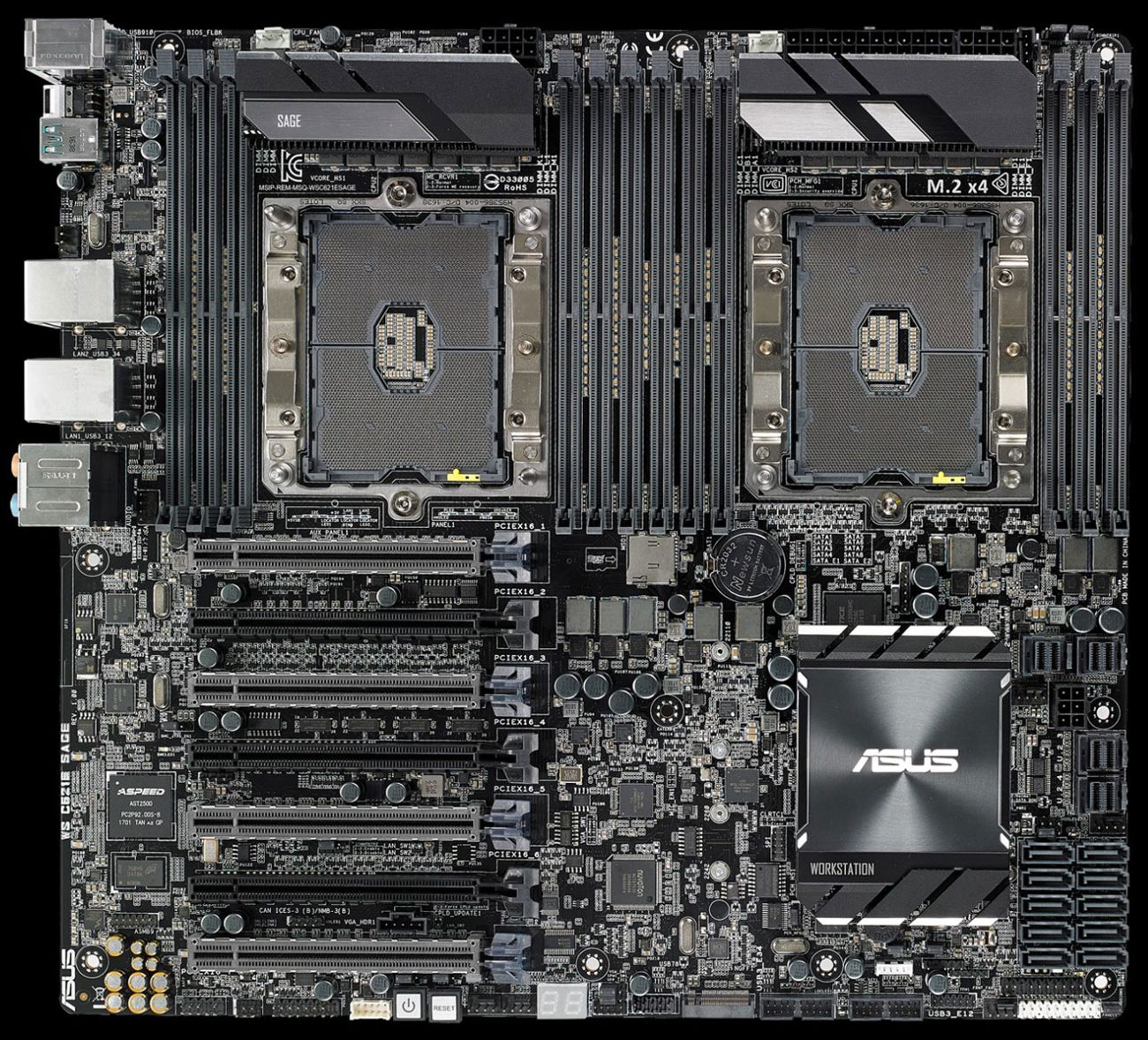 Последней рассмотренной материнской платой станет ASUS WS C621E Sage для рабочих станций, которая была анонсирована осенью этого года. Пока информации о ней не так много, кроме того, что данная плата поддерживает работу пары процессоров Intel Xeon в исполнении LGA 3647 (таких как Xeon Platinum 8180M с 28-ю ядрами и 56 потоками поколения Intel Skylake).