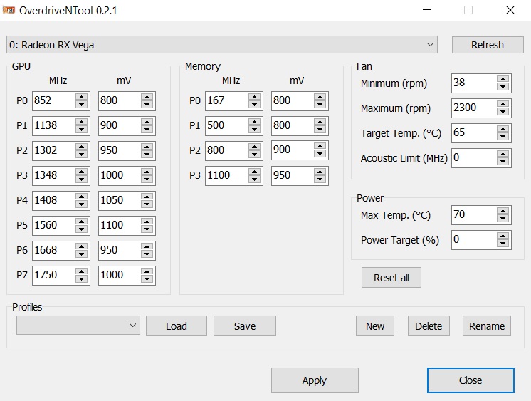 В этой части обзора я решил отойти от Wattman и использовать OverdriveNTool 0.2.1. В данной программе можно сохранять профили и вбивать все необходимые данные вручную, что для поиска стабильных значений более удобно, чем «ползунки».