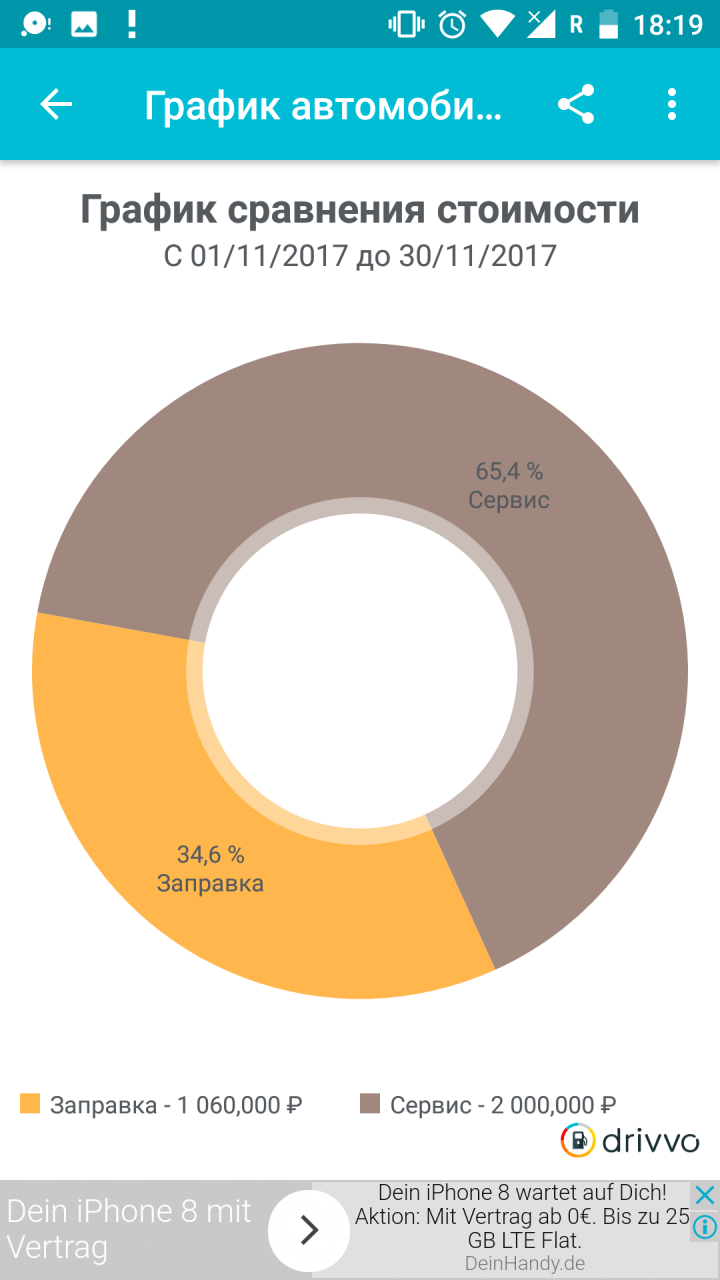 Интересно, что каждый месяц приложение Drivvo подводит статистику и в виде круговой диаграммы показывает нам, на что и в каком соотношении были потрачены деньги. Это удобно и наглядно, также этой статистикой в виде красивой картинки можно делиться в социальных сетях.