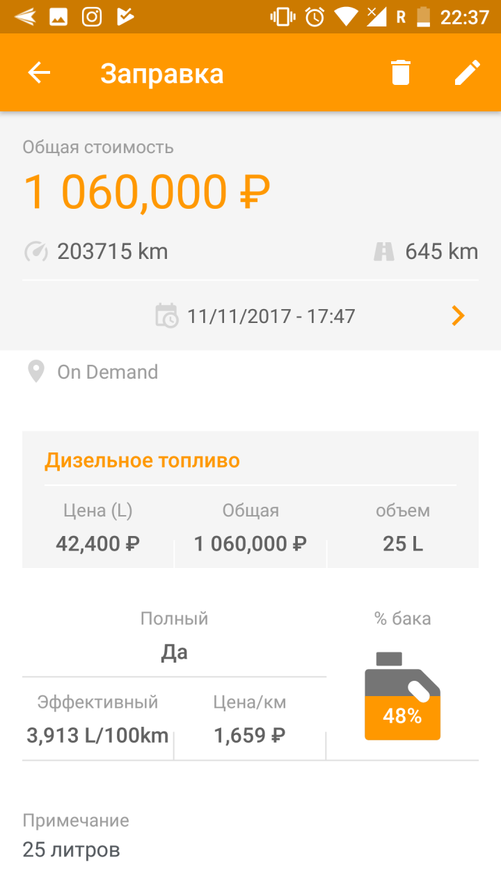 Приложение умеет максимально подробно рассчитывать расход бензина, поскольку предлагает множество параметров при вводе информации о заправке. И большое спасибо разработчикам за виджет для быстрого обновления данных о новом топливе – этого не хватает во многих утилитах. Лично меня порадовала возможность добавить фото при добавлении нового расхода.