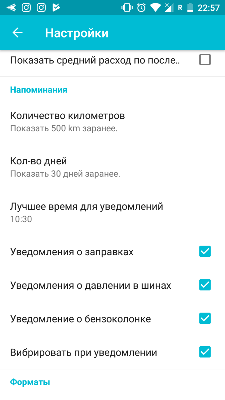 Приложение содержит минимальное количество настроек, и касаются они единиц измерения, дат, особенностей измерения расхода топлива и отображения различного рода напоминаний.