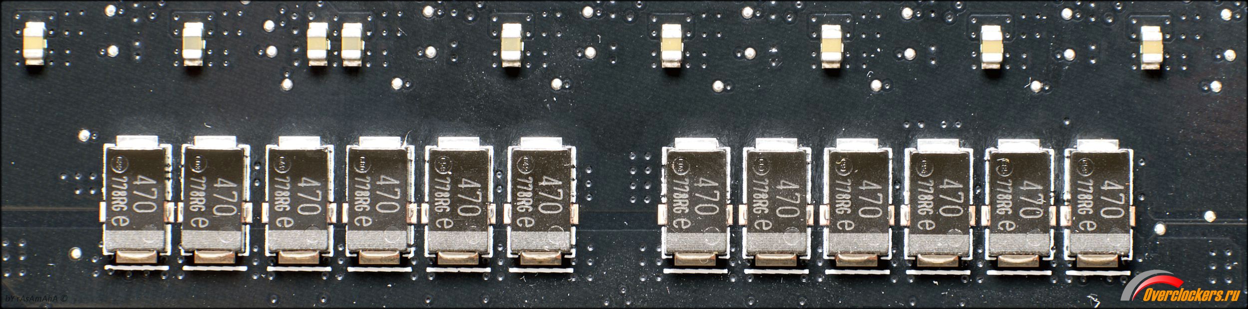 Преобразователь напряжения построен по схеме, состоящей из восьми честных фаз. Управляет ими ШИМ-контроллер ASP1405i (предположительно IR35201 или IR35203). Фазы собраны на мосфетах IR3555М, выполнены по технологии Dr.MOS и выдают до 60 А каждая.