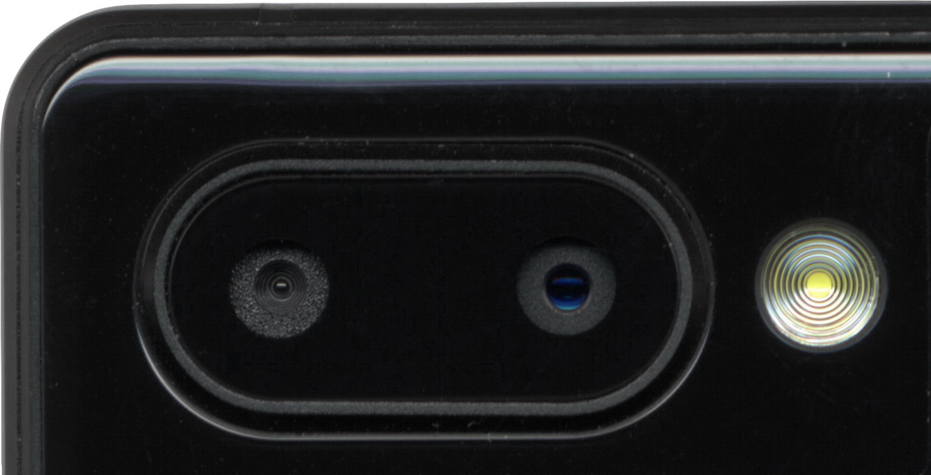 Итак, правая («главная») камера в сдвоенном блоке имеет довольно крупную переднюю линзу и просветляющее покрытие, что определяется по голубоватому отражению в ней внешней обстановки. В противоположность к ней, левая камера имеет микроскопическую линзу с серым отражением.