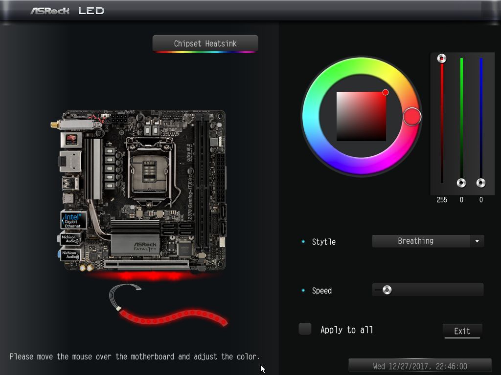 Подсветку можно настроить как в единой схеме работы, так и раздельно. Регулируется интенсивность, цвет и стиль свечения (можно отключить полностью). Все заданные настройки как в BIOS, так и в приложении сразу, перезагрузка для этого не требуется. При выключенной, но находящейся «под питанием» системе подсветка погашена.