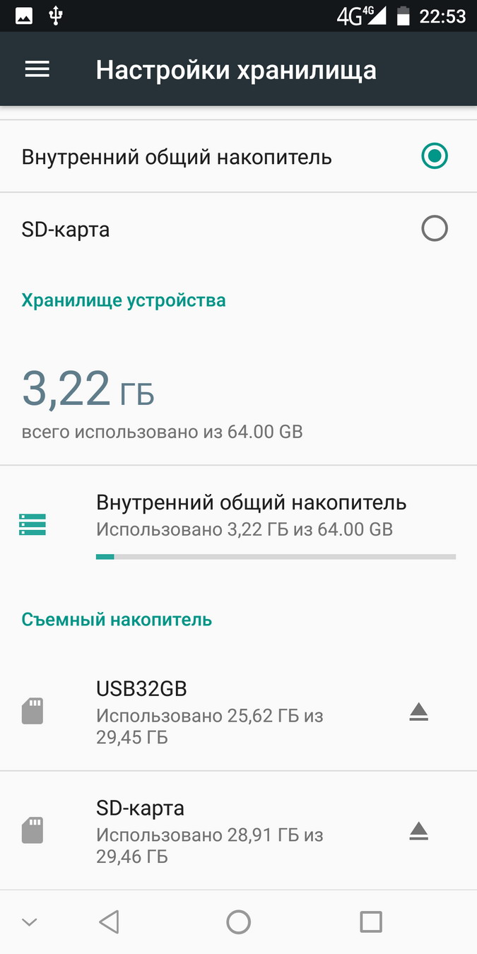 Здесь надо обратить внимание, что этот раздел («Настройки хранилища») показывает в качестве объема внутреннего накопителя, вопреки традициям, не доступную его часть (53.18 Гб), а полный объем (64 Гб), включая операционную систему и резерв. Доступный же объем показывают многие внешние утилиты, например, упомянутая выше CPU-Z. Именно этим объемом и нужно оперировать пользователю, чтобы верно оценить свои потребности и возможности.