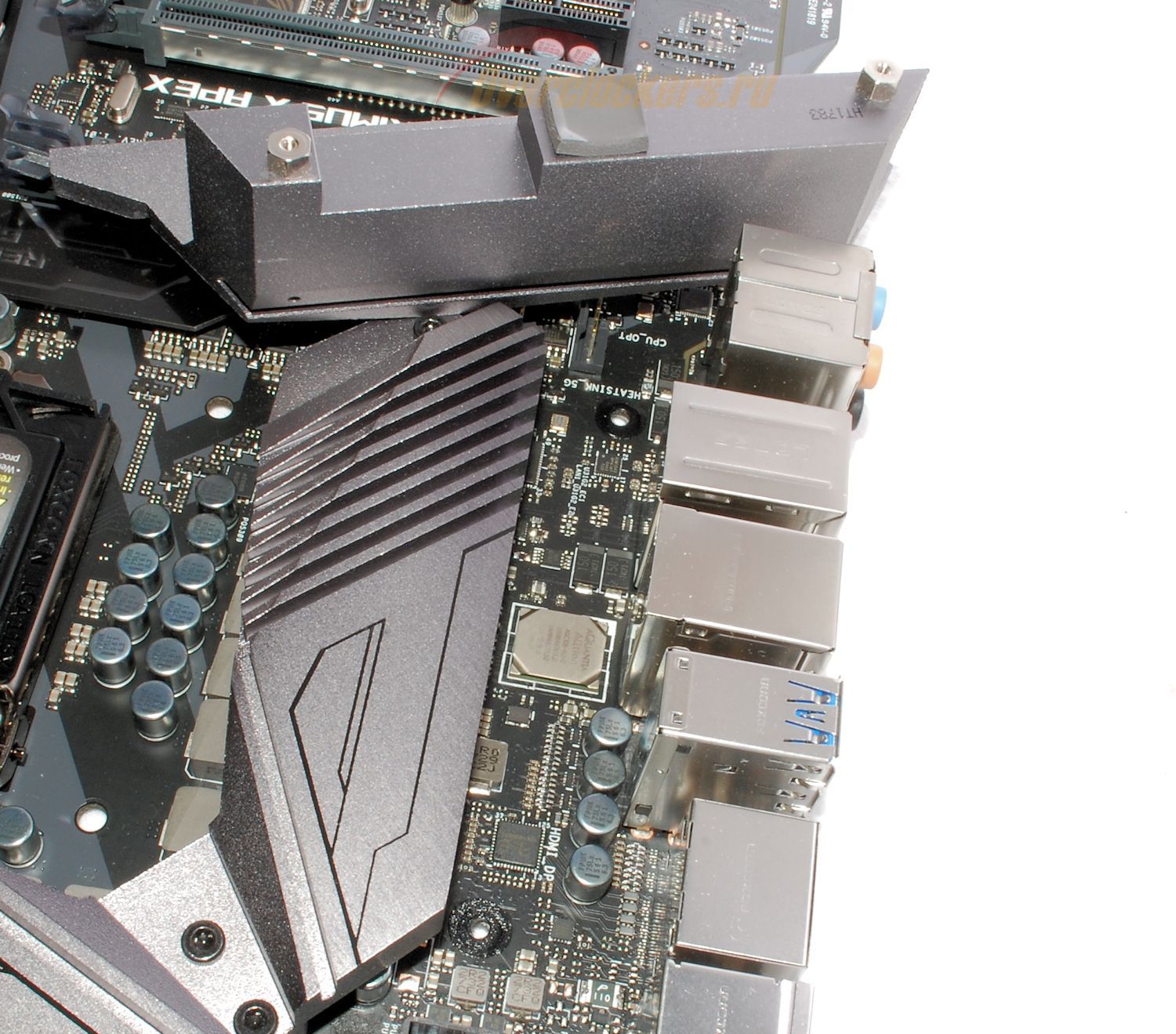Еще один сетевой контроллер скрыт под радиатором за задней интерфейсной панелью: Aquantia AQtion AQC105 нуждается в дополнительном теплоотводе в силу того, что он обеспечивает более скоростной пятигигабитный сетевой интерфейс.