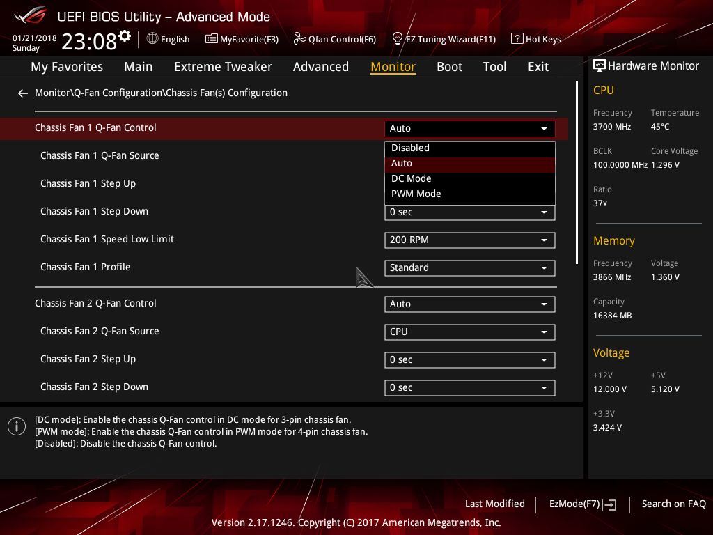Для настройки поведения вентиляторов в BIOS доступен выбор типа вентилятора/помпы (DC или ШИМ), три готовых профиля режимов работы («Стандартный», «Тихий», «Турбо») и один настраиваемый: различные уровни оборотов (от 60 до 100%) по достижению определенного настраиваемого по температуре порога (от 0° до 75° C).