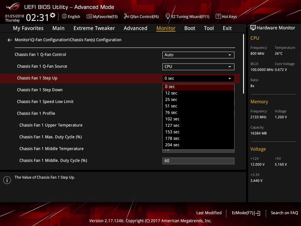 Можно настроить две отдельные задержки реакции системы управления оборотами – на снижение и на повышение температуры (доступны значения 0, 12, 25, 51, 76, 102, 127, 153, 178 и 204 секунды). Для разъемов CHA_FAN1, CHA_FAN2 и CHA_FAN3 можно выбирать источник значения температуры, в роли которого могут использоваться датчики в процессоре, на материнской плате, в подсистеме питания процессора, в кристалле набора системной логики и выносные термопары.