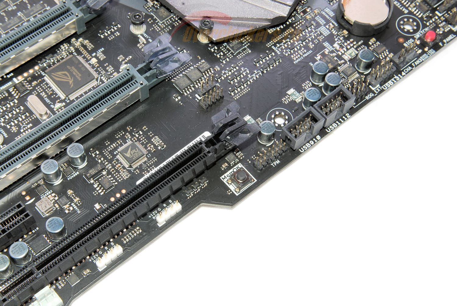 Слоты оснащены классическими подвижными защелками с верхнего края и пазом-защелкой с нижнего края, при это расстояние до верхнего PEG таково, что проблем при установке длинномерных видеокарт не возникло, даже если бы защелки были классическими с обоих концов слотов.