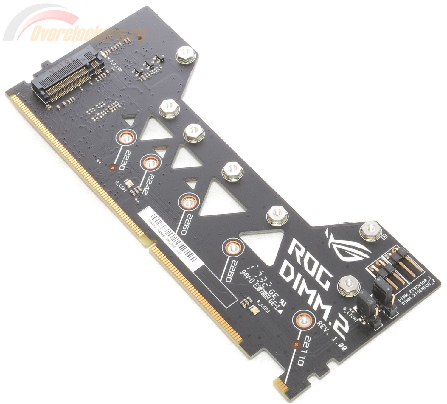 Еще две платы расширения в форм-факторе M.2 (мы же помним, что в этом форм-факторе выпускаются не только SSD, но и вполне себе обыденные дополнительные платы-контроллеры вроде Wi-Fi) можно подключить через специальный двусторонний модуль ASUS ROG DIMM.2.