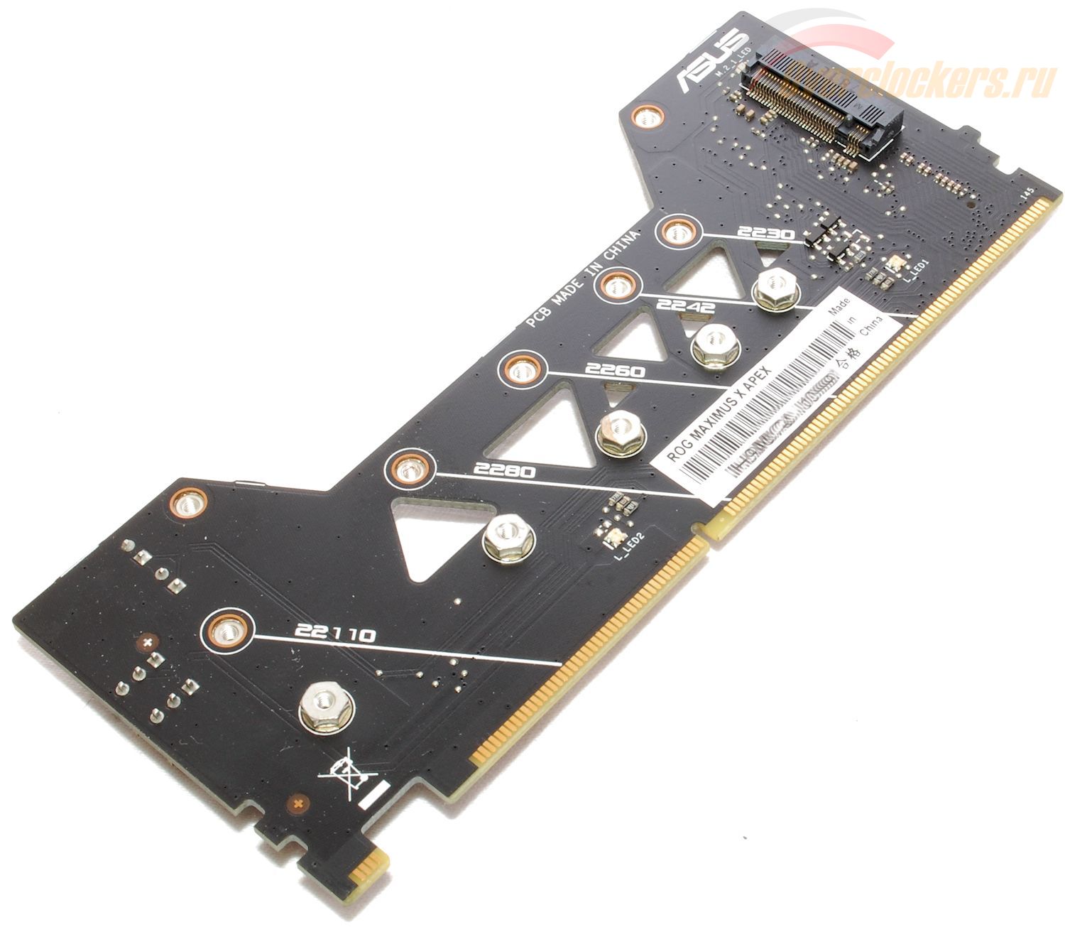 А вот с отводом тепла от накопителей (или других плат расширения M.2) могут возникнуть проблемы: на обращенной в сторону процессорного разъема плате расширения поместится лишь небольшой радиатор. Впрочем, и тут инженеры ASUS отличились предусмотрительностью: на модуле есть отверстия, а в комплекте материнской платы имеется крепеж для установки вентилятора.