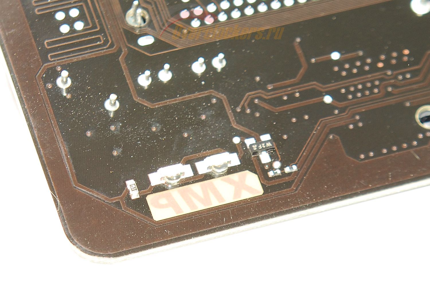 Вдоль участков «пустого» текстолита с тыльной стороны платы размещена цепочка светодиодов, светящих красным цветом.