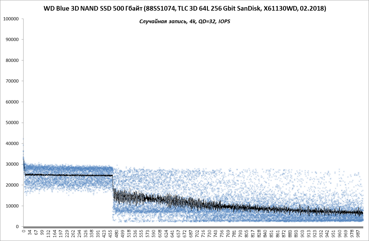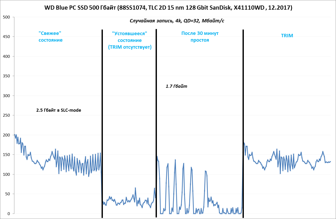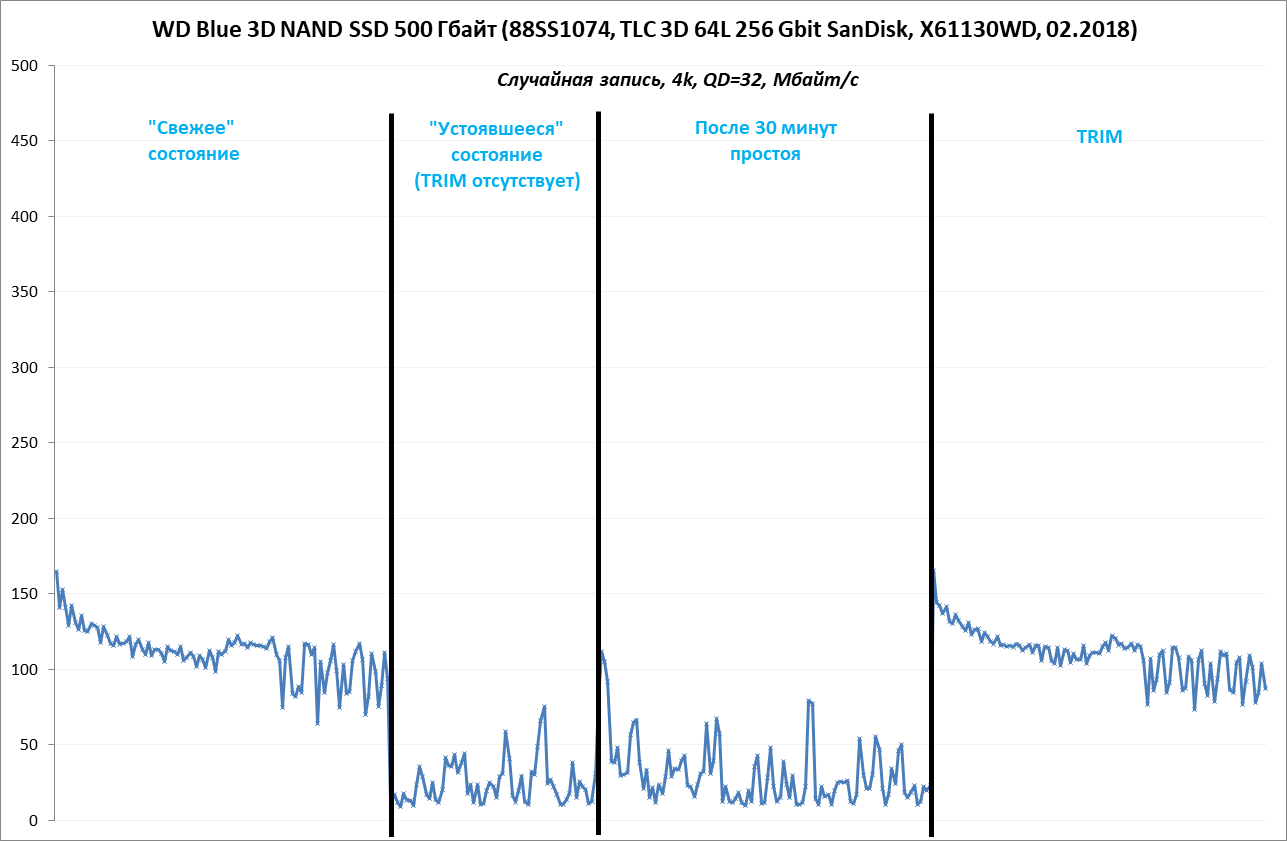 С возможностью работы в условиях отсутствия TRIM своя история: если старая версия WD Blue еще могла принимать около 1.7 Гбайт данных на относительно высокой скорости (пусть и делая это «всплесками»), то новая версия на памяти с вертикальной компоновкой ячеек практически лишилась даже такой возможности. Похоже, что некоторый объем есть, но из-за вида графика записи, мало чем отличающегося от работы в «замусоренном» состоянии, это больше похоже на случайное колебание.