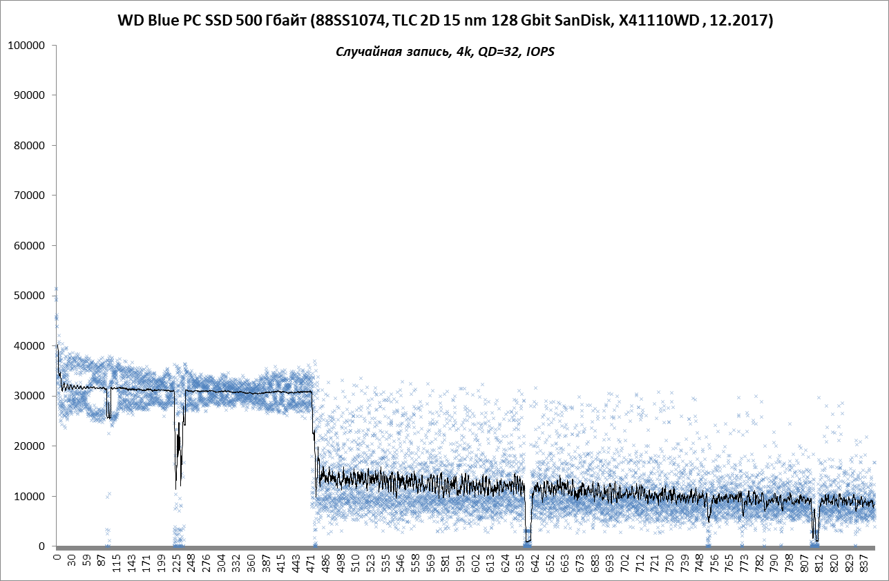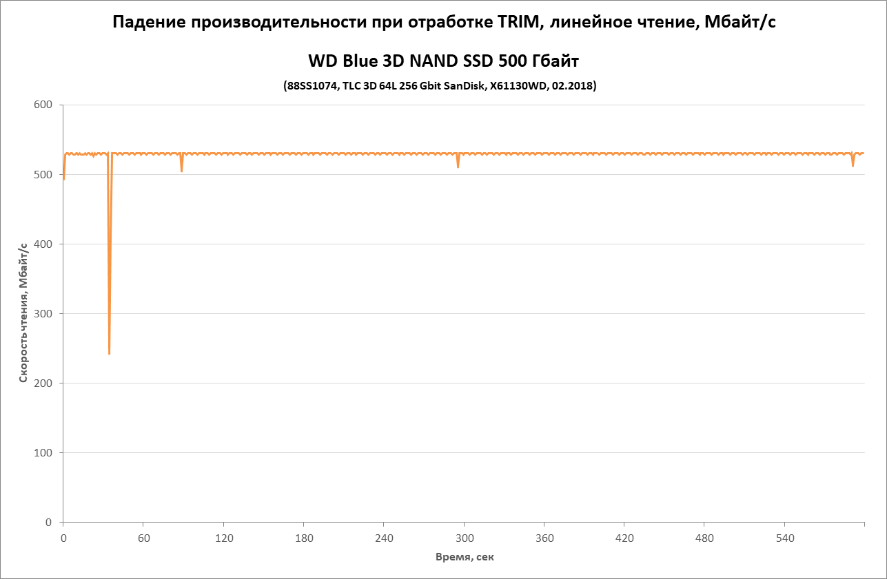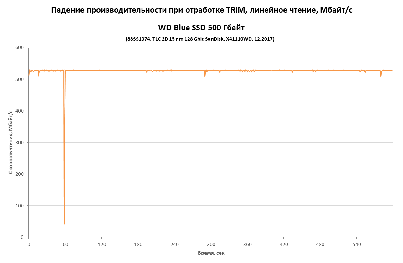 С возможностью работы в условиях отсутствия TRIM своя история: если старая версия WD Blue еще могла принимать около 1.7 Гбайт данных на относительно высокой скорости (пусть и делая это «всплесками»), то новая версия на памяти с вертикальной компоновкой ячеек практически лишилась даже такой возможности. Похоже, что некоторый объем есть, но из-за вида графика записи, мало чем отличающегося от работы в «замусоренном» состоянии, это больше похоже на случайное колебание.
