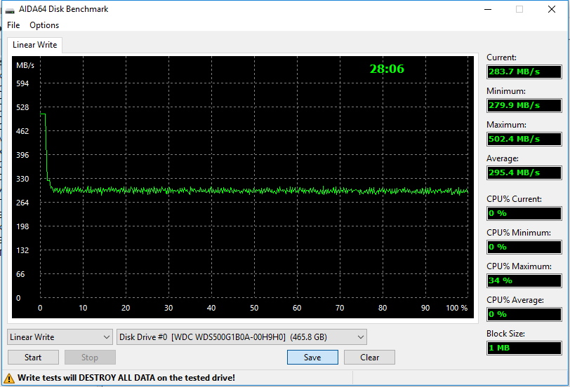 На крупноблочной записи поведение накопителей иногда может отличаться от мелкоблочной записи со случайным доступом, а оно тоже может служить критерием выбора. Наглядный пример нагрузки такого рода – копирование крупных файлов силами Проводника Windows. Для большей наглядности инициируем линейную запись на весь объем, доступный пользователю, посредством AIDA64.