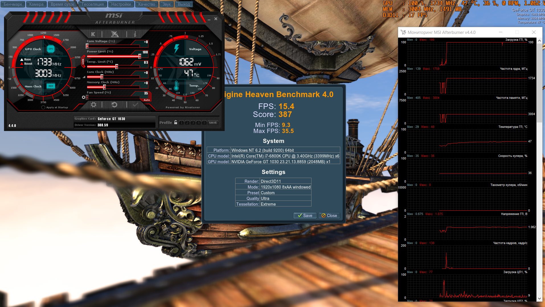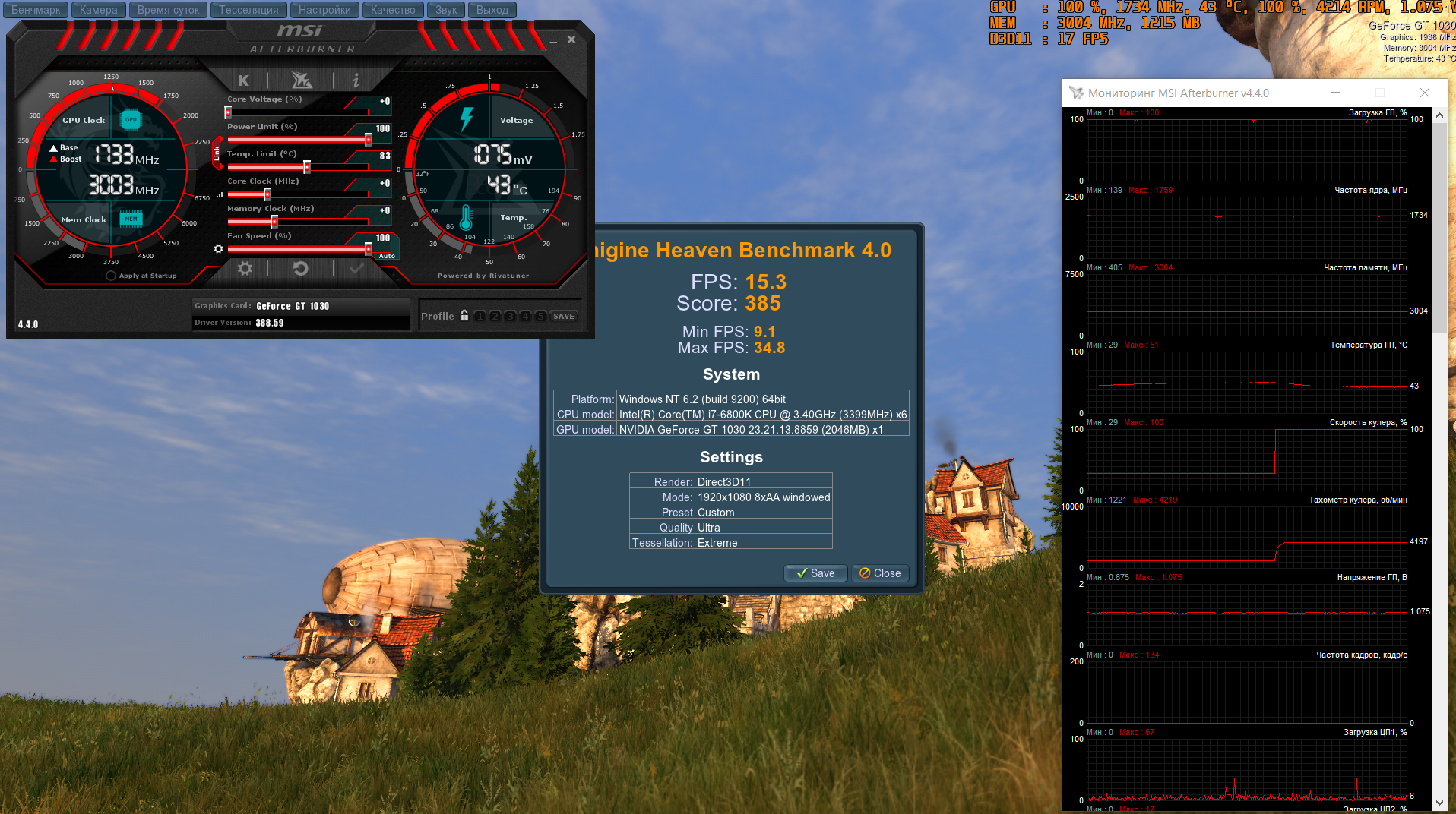 Проверка стабильности работы ускорителей в процессе разгона и температурного режима в условиях, приближенных к повседневным, проводилась при помощи программ Heaven BenchMark v4.0 (quality: ultra, tessellation: extreme, AA8x, 1920 х 1080) и 3DMark 2013 Fire Strike.