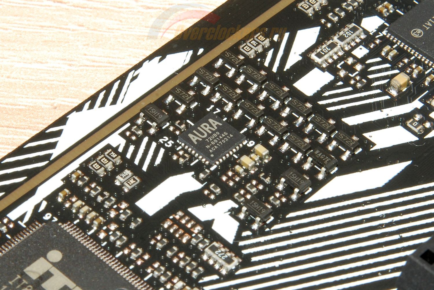 Здесь мы найдем сетевой гигабитный контроллер Intel i211AT, контроллер ввода-вывода (I/O) ITE IT8665E, контроллер светодиодной подсветки ASUS Aura, а также аудиотракт на базе контроллера Realtek ALC1220 в компании высококачественных конденсаторов Nichicon.