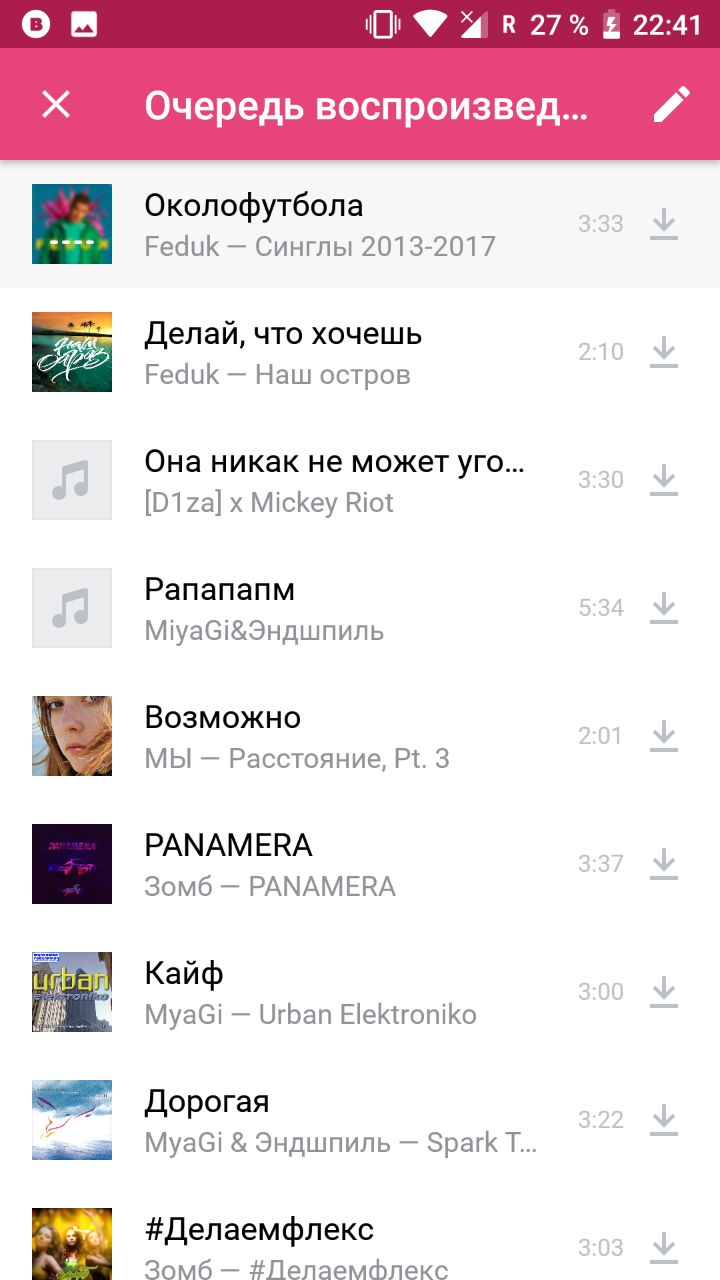 Самое последнее меню предоставляется под все наши избранные треки из социальных сетей. Там же можно сохранить их к себе на устройство (естественно, при наличии подписки) и перейти к прослушиванию.