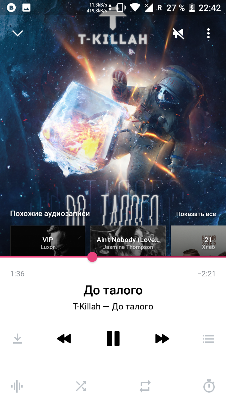 Кроме загрузки треков, скролла и клавиши старта/паузы, предусмотрен эквалайзер, выбор режима перехода между треками, повтор, таймер отключения и отображение текста. Самое же интересное – это подбор похожих аудиозаписей и мгновенный переход к ним.