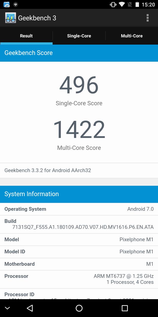 Смартфон из ультрабюджетного сегмента априори не может комплектоваться высокопроизводительной аппаратной платформой, да от него это и не ожидается. В данном случае установлен четырехъядерный процессор MediaTek MT6737 с тактовой частотой каждого ядра до 1.3 ГГц. Хотя приложение CPU-Z определяет SoC как младшую версию.