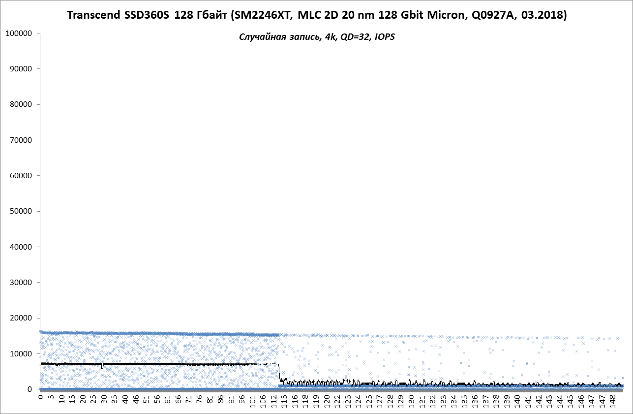 Тест проводится непрерывно в течение нескольких часов до исчерпания свободного места на накопителе, при этом снимаются показатели быстродействия: синие отметки – ежесекундно, черная линия – усредненное значение с интервалом в 30 секунд. Непрерывная мелкоблочная запись с большой глубиной очереди запросов, да еще при отсутствии TRIM – тип нагрузки, нехарактерный для домашних ПК, но он иллюстрирует то, насколько производительна и стабильна в показателях использованная в тестируемых накопителях аппаратная платформа в целом.