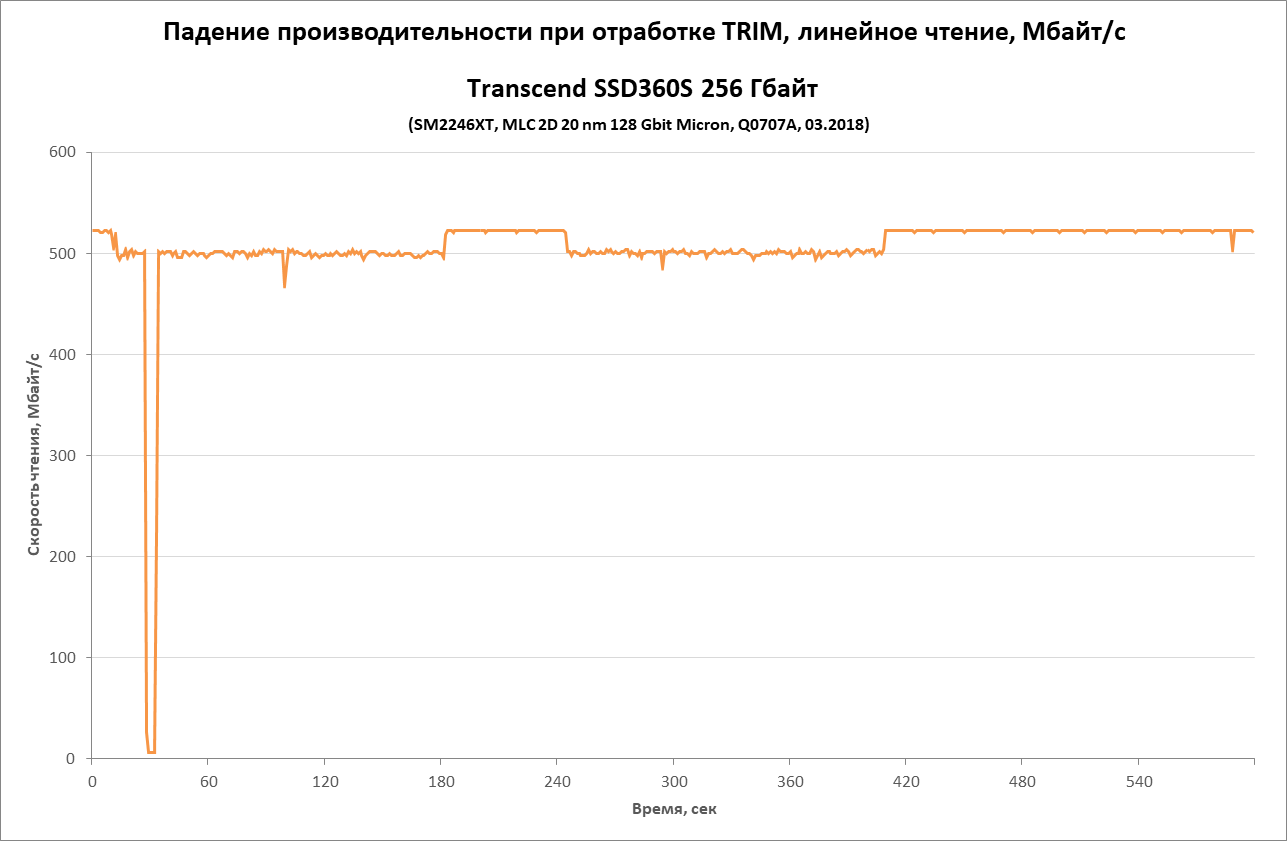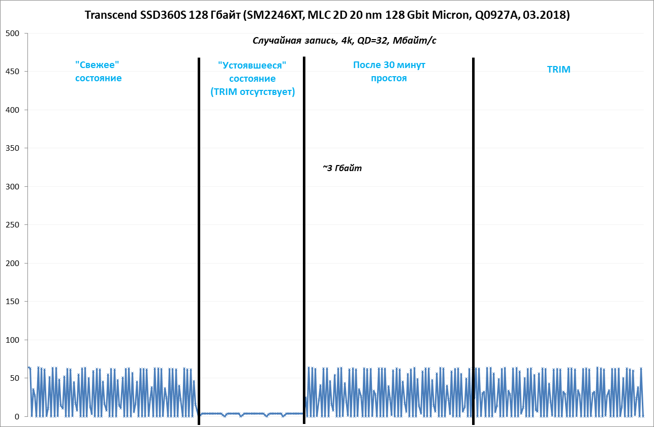 И оба накопителя умеют работать в условиях отсутствия TRIM. Причем здесь необычный SSD360S тоже отличился: объем принимаемых данных невелик и раз так в 10 меньше, чем стоило бы ожидать, исходя из результата SSD360S на 128 Гбайт.