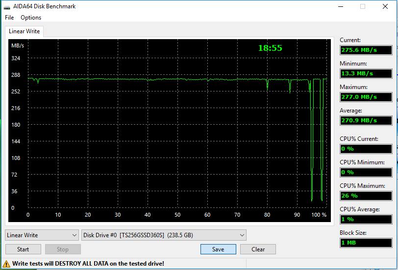 На крупноблочной записи поведение накопителей иногда может отличаться от мелкоблочной записи со случайным доступом, а оно тоже может служить критерием выбора. Наглядный пример нагрузки такого рода – копирование крупных файлов силами Проводника Windows. Для большей наглядности инициируем линейную запись на весь объем, доступный пользователю, посредством AIDA64.