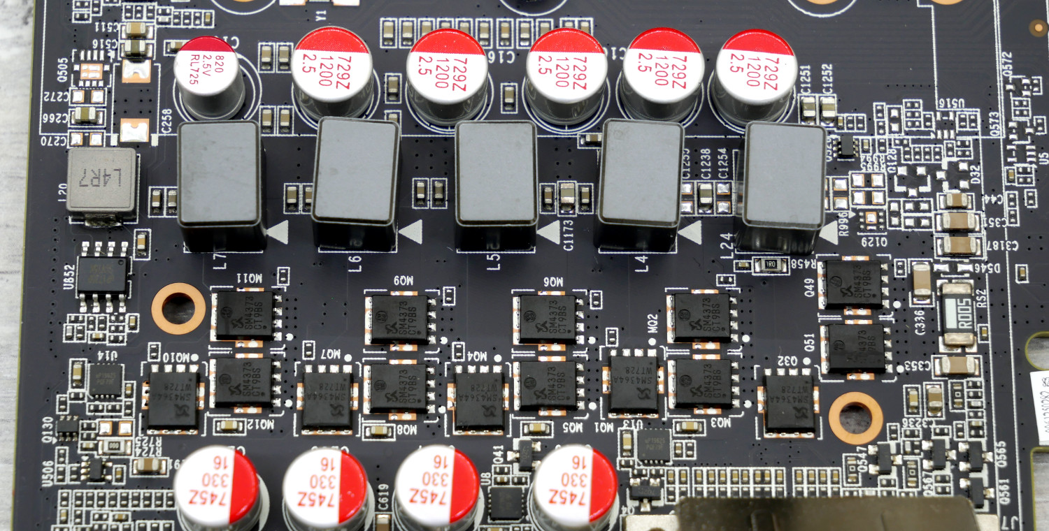 Общая формула подсистемы питания насчитывает пять фаз: четыре фазы отведены на графический процессор, одна – на видеопамять.