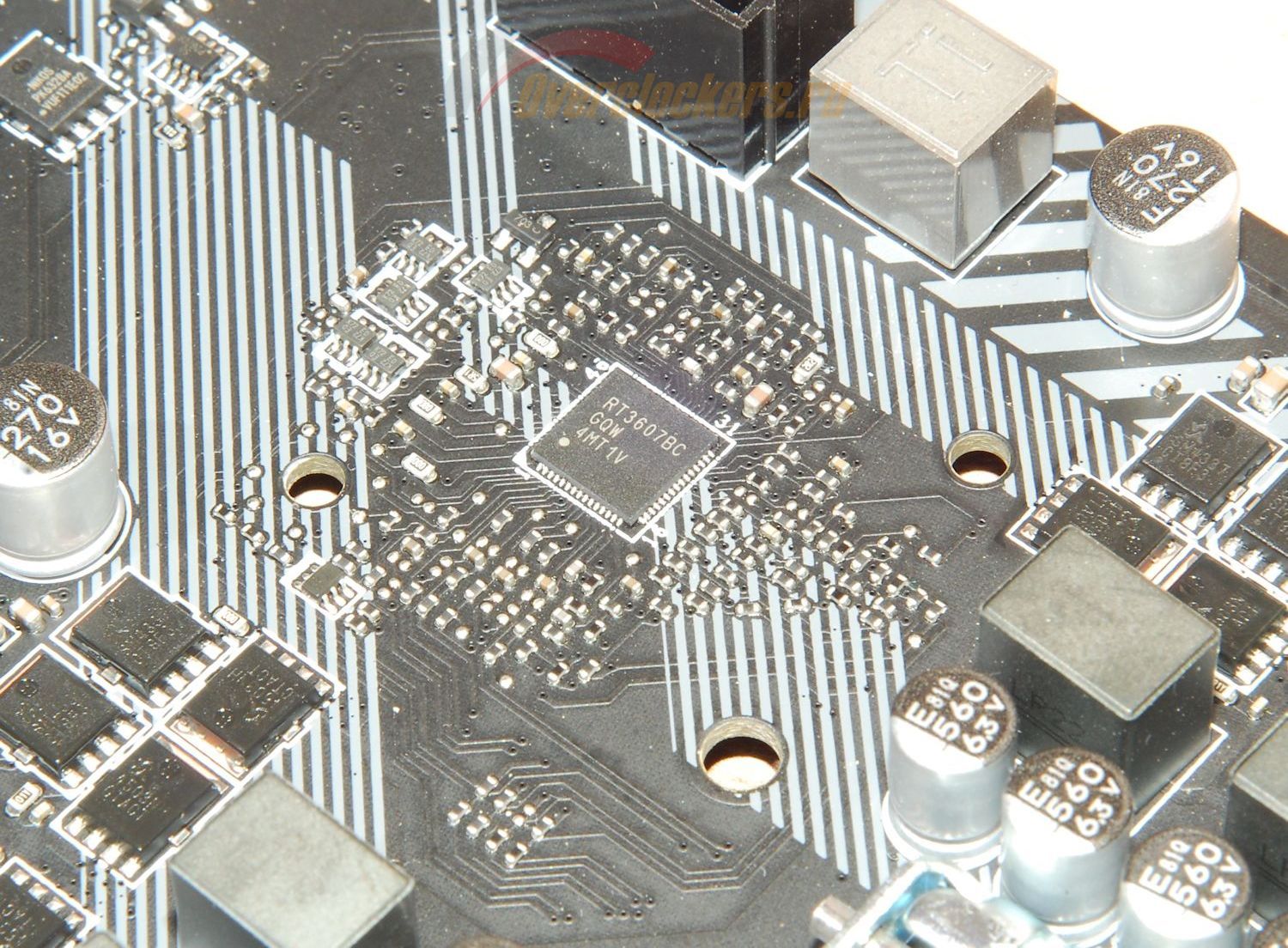 На рассматриваемой плате питание процессора построено по схеме: однофазный независимый преобразователь VCCSA, однофазный независимый преобразователь VCCIO, четырехфазный VCore и двухфазный iGPU под управлением общего ШИМ-контроллера Richtek RT3607BC.