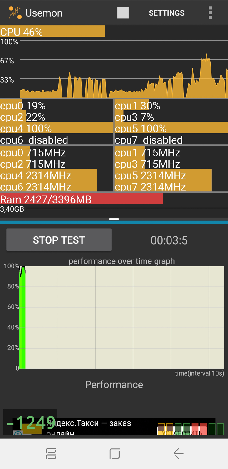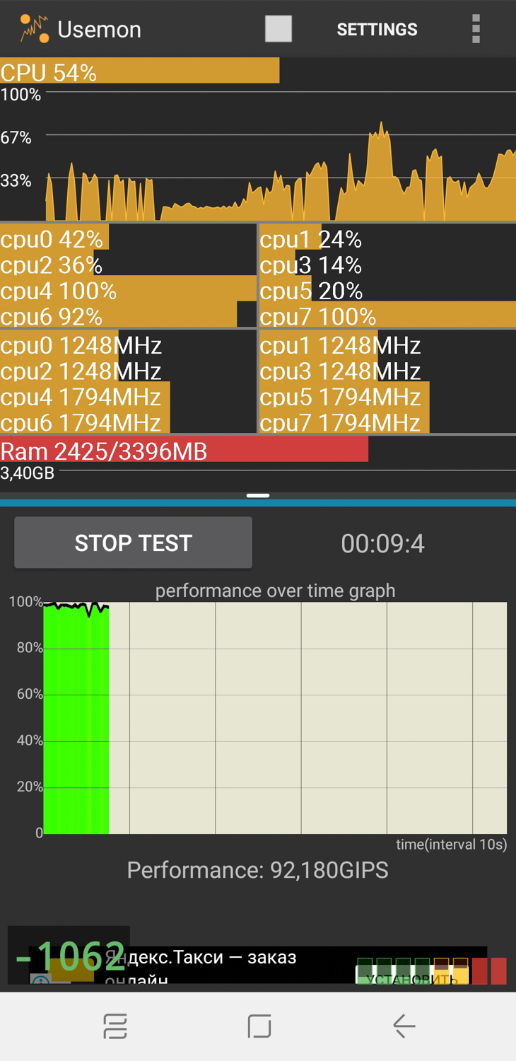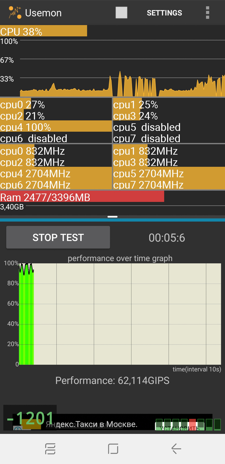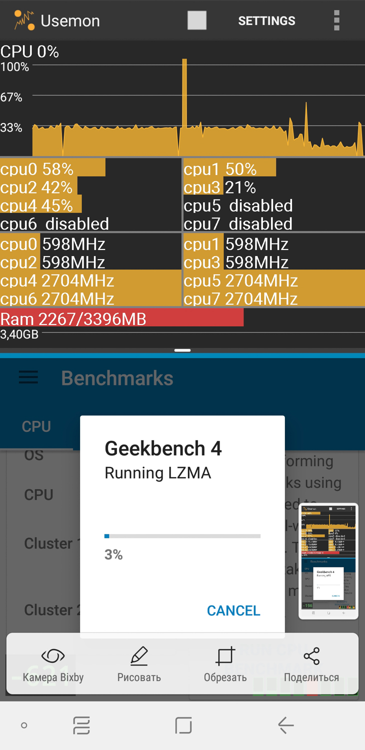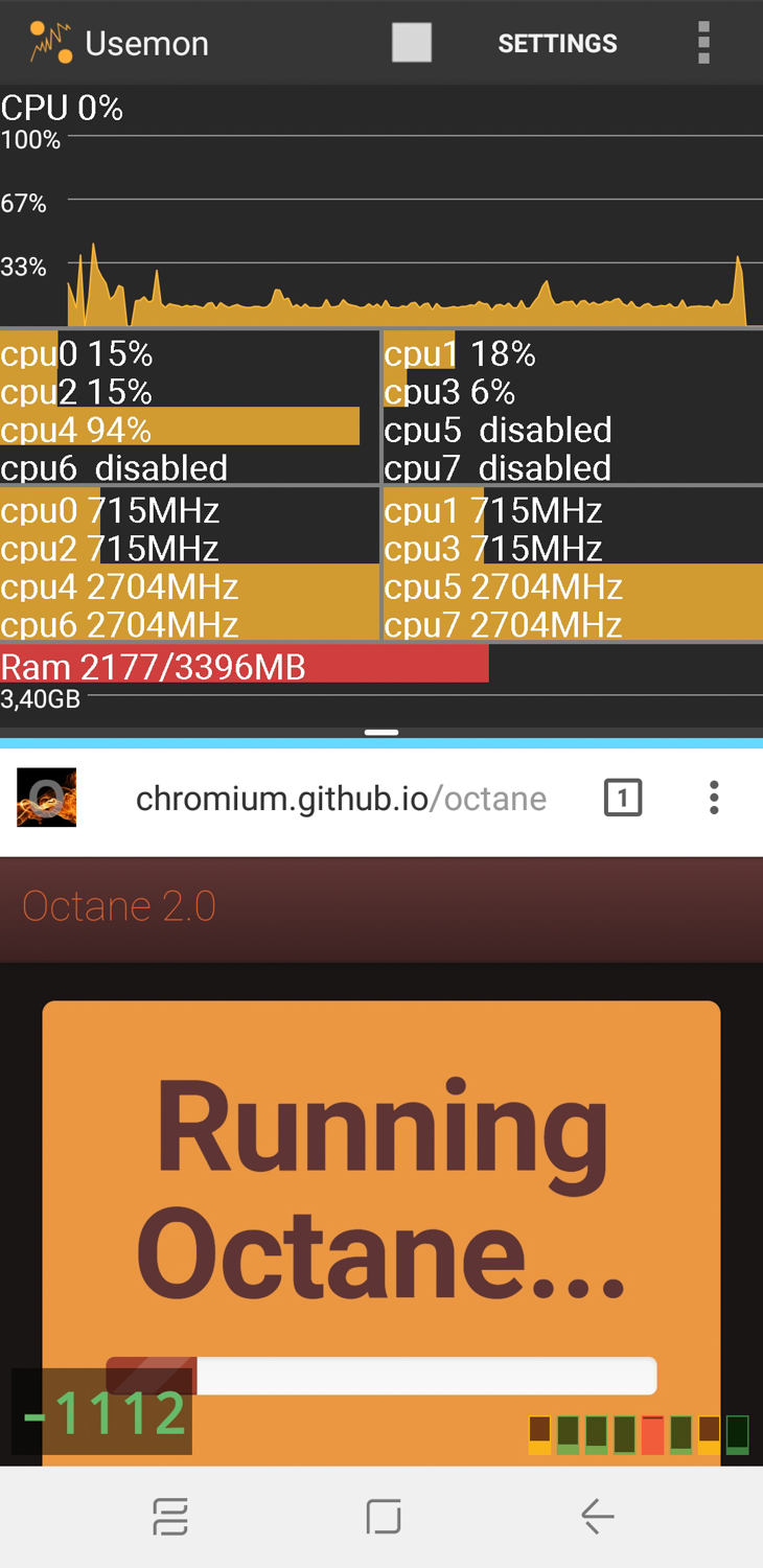 На этом моменте все стало немного запутанно, поэтому надо понаблюдать за CPU частью под нагрузкой. Без root-доступа это сложно, но не значит невозможно. Мы знаем, что в Linpack «система-на-чипе» показала себя так, как и должна, и можем посмотреть, как распределяется нагрузка по ядрам в таком случае.