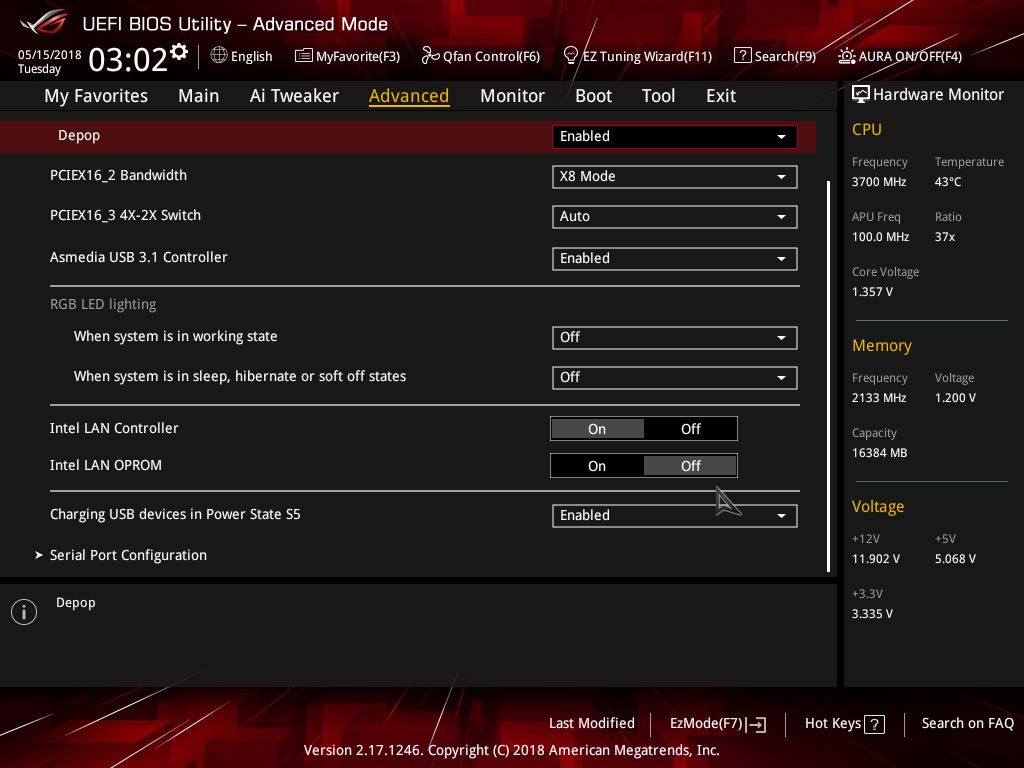 Следует заметить, что при установке AMD Ryzen 5 2200G в BIOS материнской платы в разделе Ai Tweaker отображается дополнительный параметр GFX core voltage, который можно изменять в пределах 0.00625 – 1.55000 В с шагом 0.00625 В.