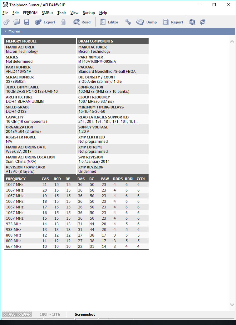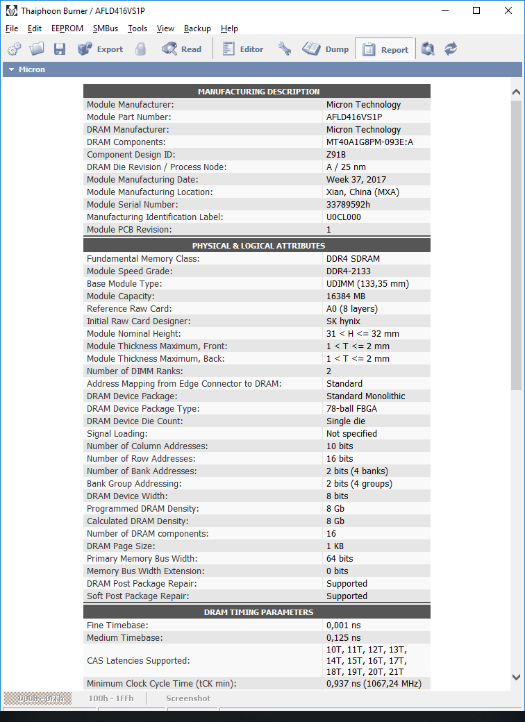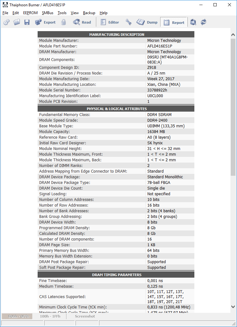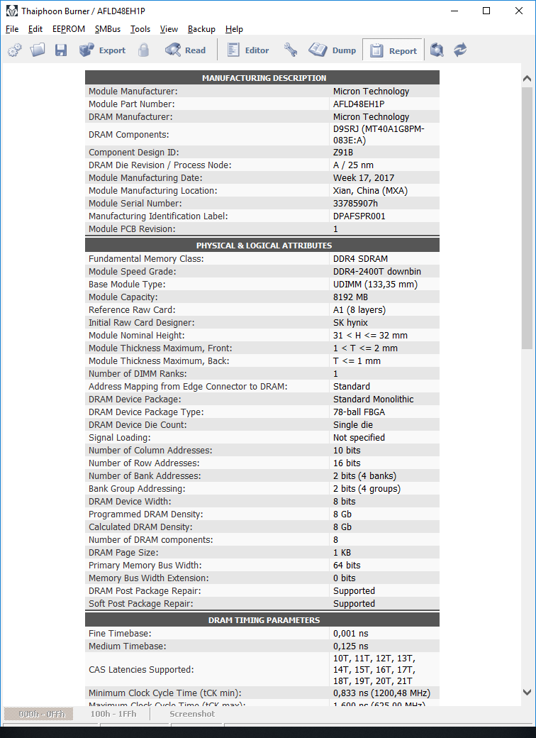 Модули выполнены на восьмислойной печатной плате. В SPD записаны профили, соответствующие стандартам JEDEC: 1333, 1600, 1866 МГц (тайминги 13-13-13-31) и 2133 (15-15-15-36). Номинальная частота 2133 МГц. Дата сборки – 40-я неделя 2017 года. Дамп SPD: ссылка.