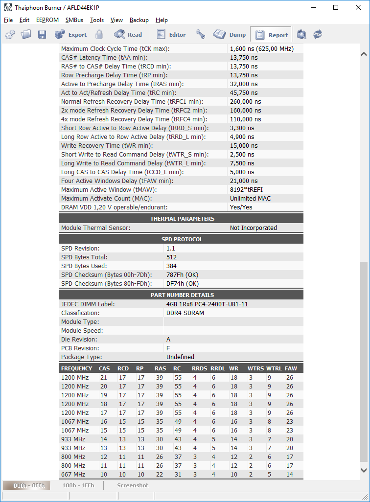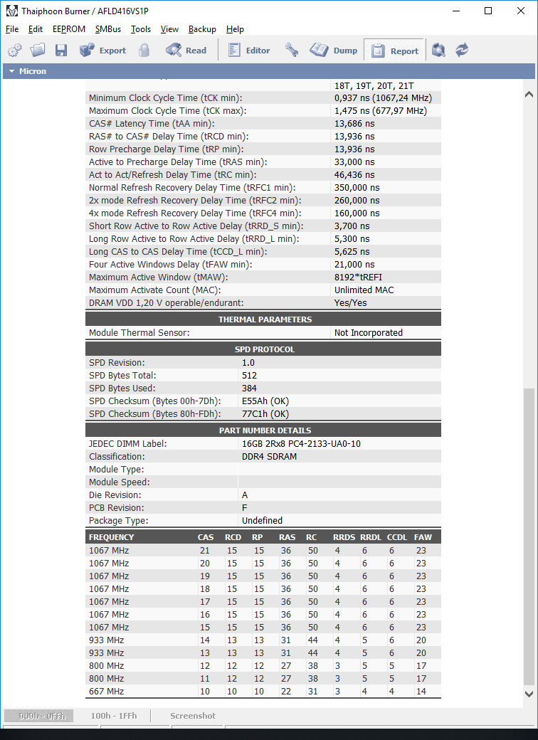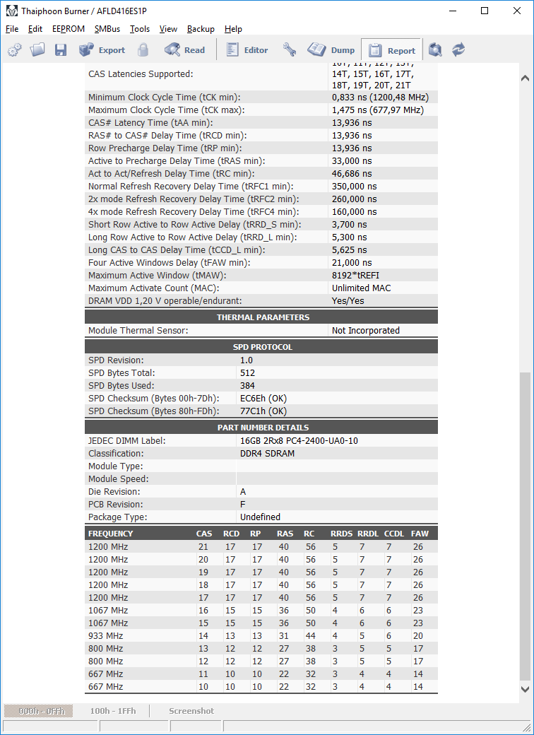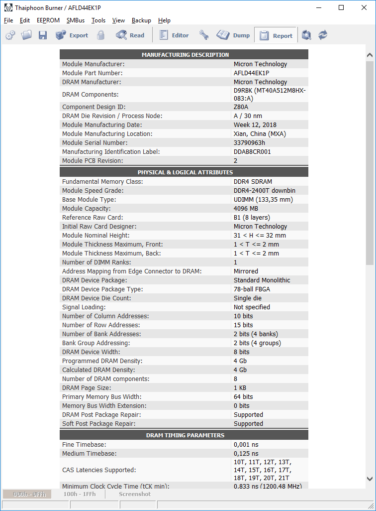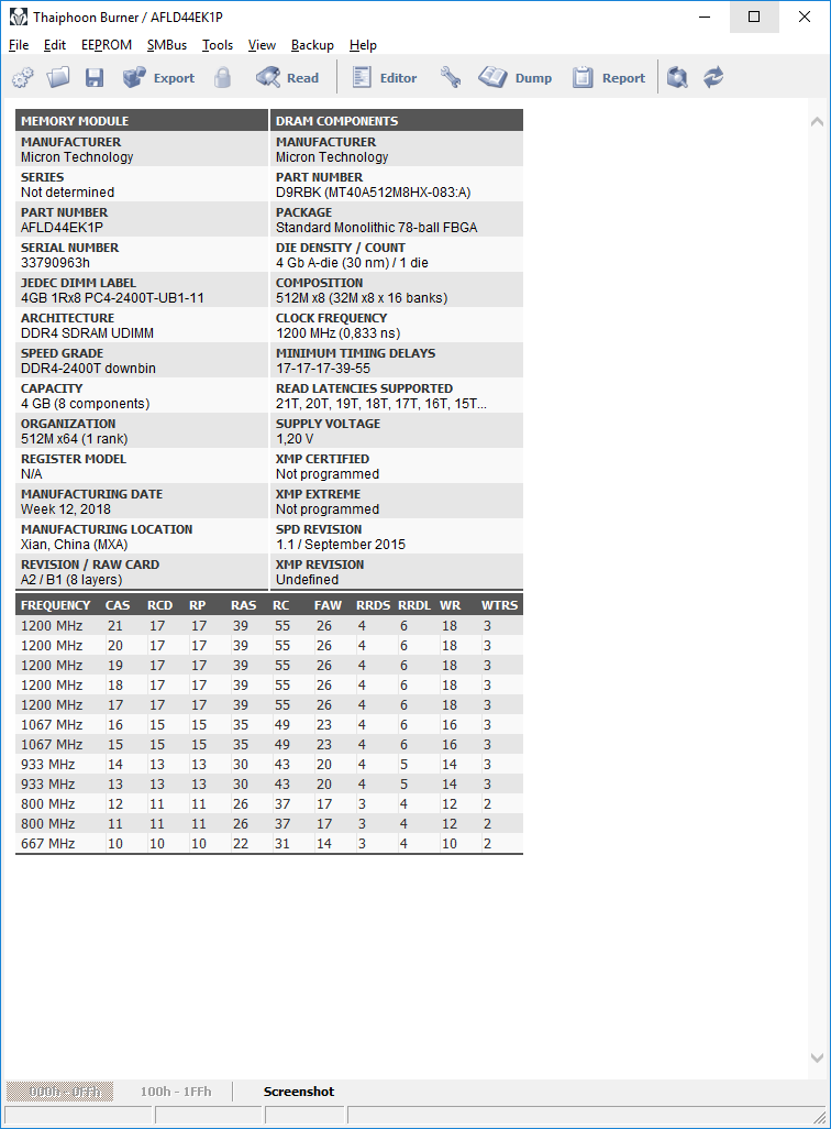 Модули выполнены на восьмислойной печатной плате. В SPD записаны профили, соответствующие стандартам JEDEC: 1333, 1600, 1866 МГц (тайминги 13-13-13-31) и 2133 (15-15-15-36). Номинальная частота 2133 МГц. Дата сборки – 40-я неделя 2017 года. Дамп SPD: ссылка.