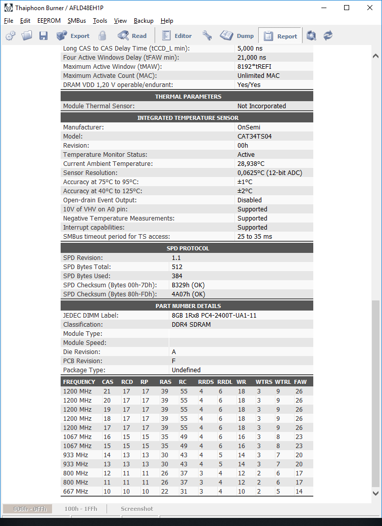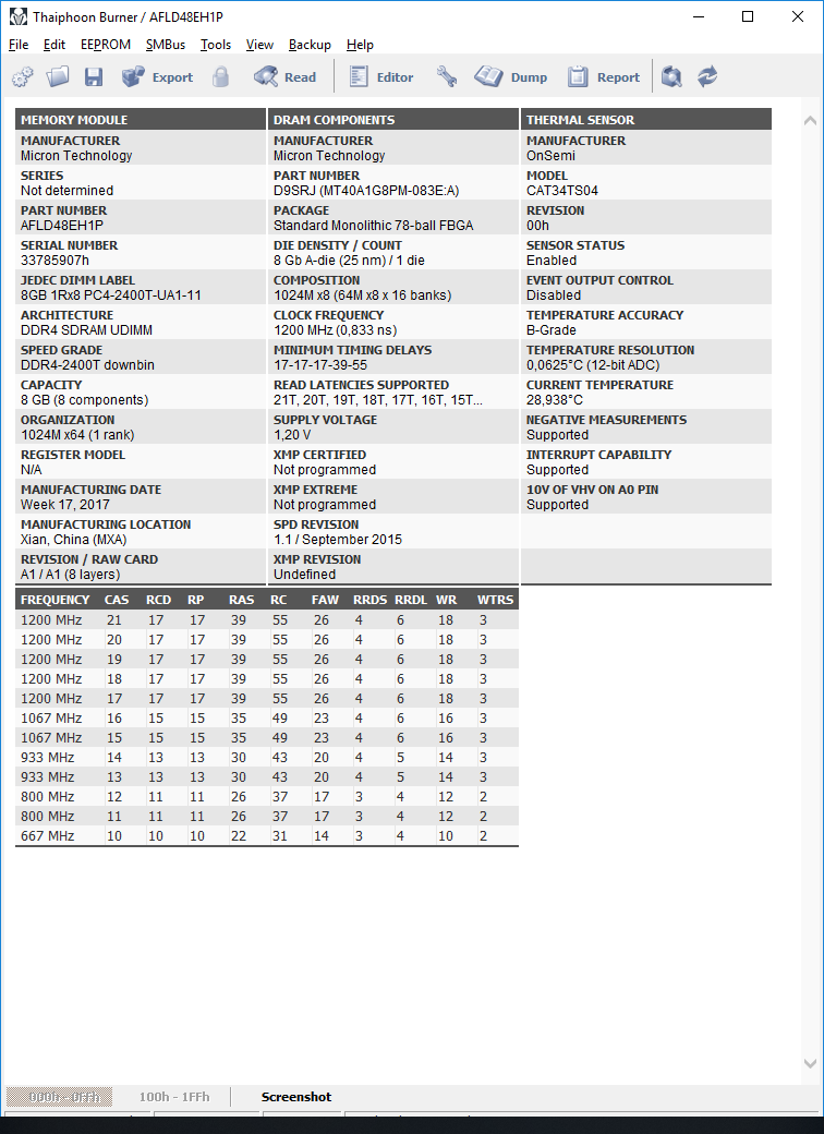 Модули выполнены на восьмислойной печатной плате. В SPD записаны профили, соответствующие стандартам JEDEC: 1333, 1600, 1866, 2133 и 2400 МГц. Последний с таймингами 17-17-17-39 и напряжением 1.2 В является номинальным режимом работы модулей. Неожиданно обнаружился программный мониторинг температур. Дата сборки – 17-я неделя 2017 года. Дамп SPD: ссылка.
