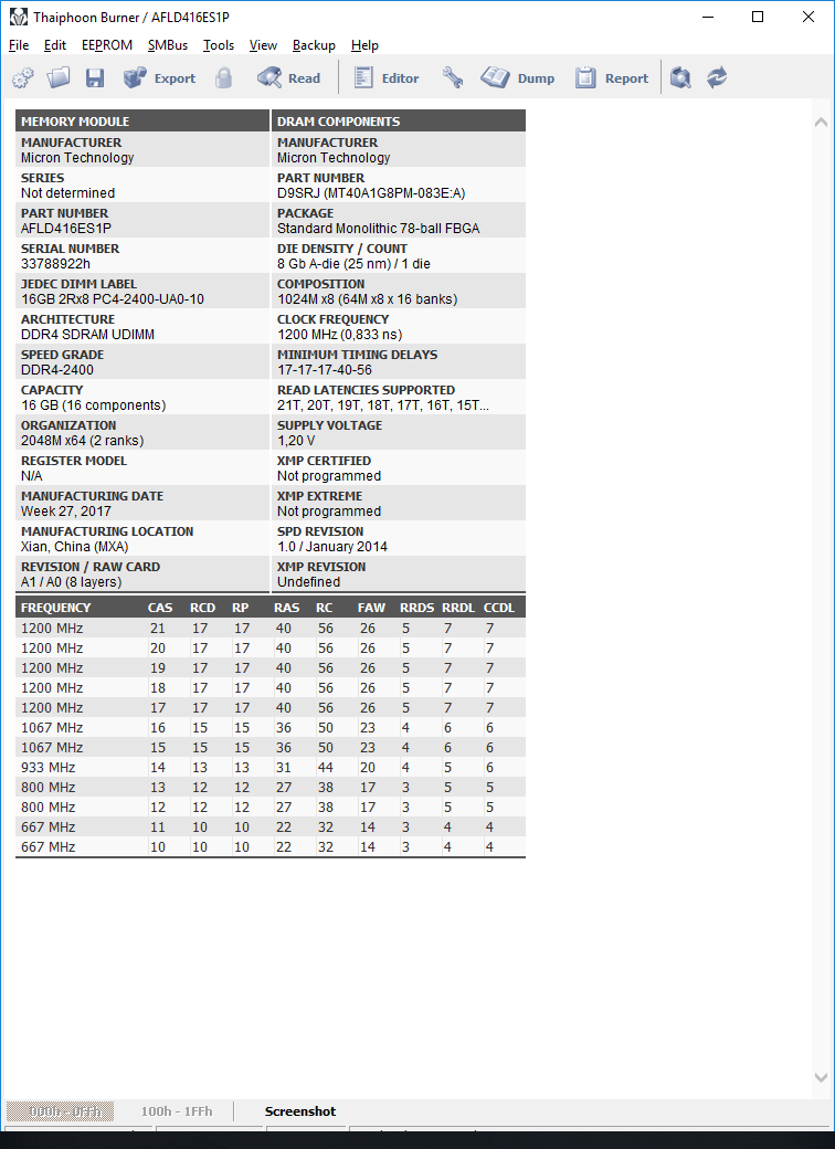 25 нм Micron A-die и двухранговое строение на восьмислойной печатной плате. В SPD записаны профили, соответствующие стандартам JEDEC: 1333, 1600, 1866, 2133 и 2400 МГц. Последнее значение частоты, в связке с таймингами 17-17-17-40 и напряжением 1.2 В, является номинальным режимом работы модулей. Дата сборки – 27-я неделя 2017 года. Дамп SPD: ссылка.