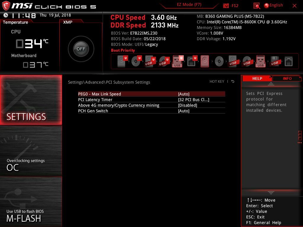 Из двух PEG подключен к процессору только верхний (он является слотом PCI-Express 3.0 x16). Второй PEG физически является PCI-Express 3.0 x4 и вместе с четырьмя PCI-Express 3.0 x1 подключен к набору системной логики Intel B360.