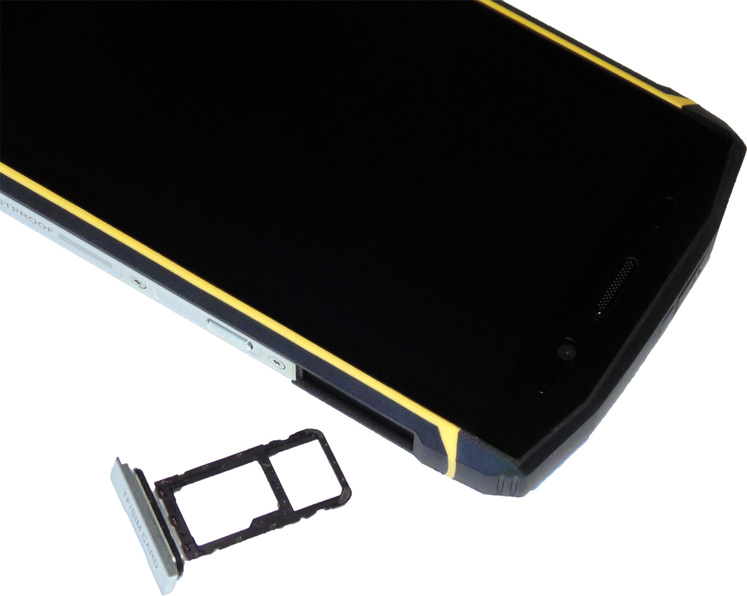 Справа можно увидеть слот для SIM-карт и карты памяти. Он также снабжен уплотнением для герметизации отсека. Ниже находится кнопка управления питанием и надпись о защите от проникновения пыли.