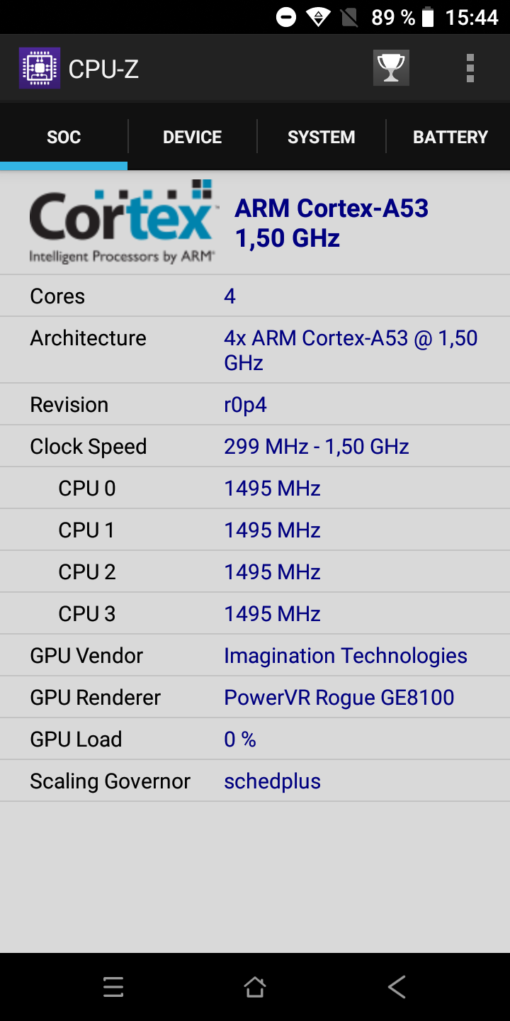 Аппаратная платформа построена на базе бюджетного процессора MediaTek MT6739, тактовая частота ядер которого достигает 1.5 ГГц. В качестве видеоядра применено PowerVR Rogue GE8100. Объем оперативной памяти в 2 Гбайта не поражает воображение, по современным меркам это приемлемый минимум.