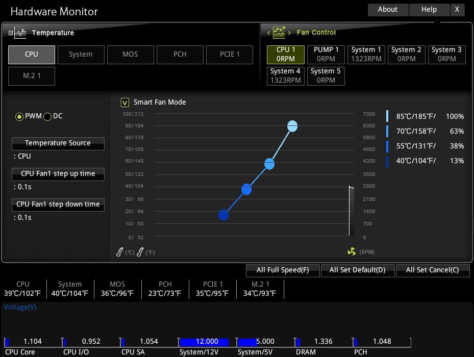 Не менее легко на лету переключается и тип управления, линейный или «умный» с подстройкой по пользовательским точкам. Если на заданной величине напряжения вентилятор не может поддерживать скорость вращения крыльчатки, то он останавливается.