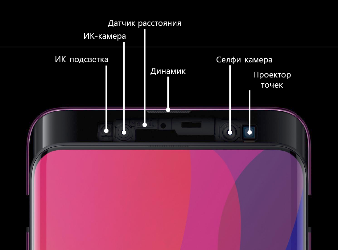 Два модуля камер и одинокая вспышка посредине, никаких неожиданностей. То ли дело спереди. На черной глянцевой поверхности смартфона сложно что-то разглядеть, но производитель заботливо приводит схему расположения элементов с фронтальной стороны слайдера, да еще и русифицировал ее для нас с вами: